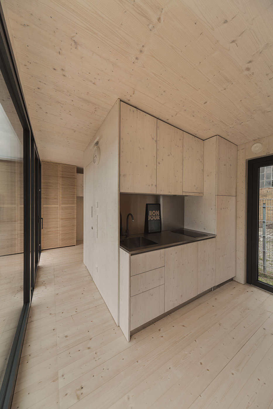 The design of the house was created for series production, a module characterised by a simple floor plan and an integrated module. The interior of the house is elegant and functional, the multifunctional accessories and storage spaces make it not to feel cramped