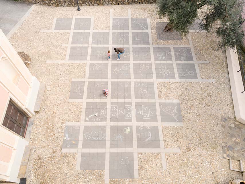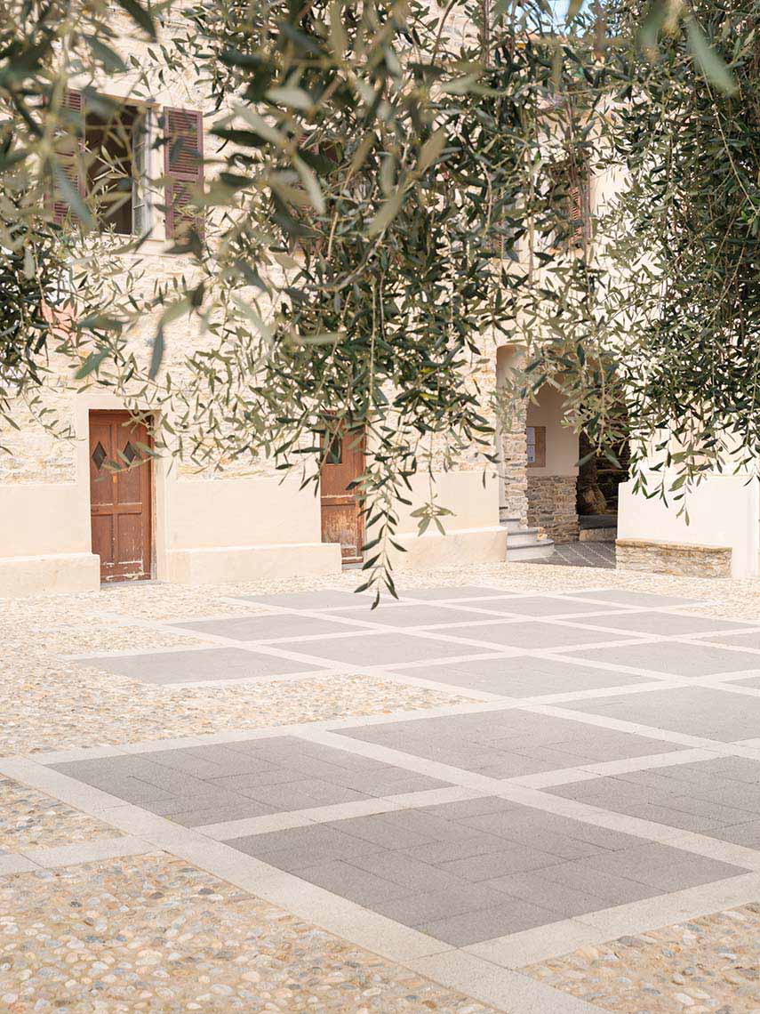 Oui, le jeu de textures et les variations chromatiques se confrontent aux pierres de rivière et aux BIG, protagonistes de la pavementation. Pour préserver la flexibilité de l'espace, l'architecte a préféré ne pas ajouter de nouveaux bancs, mais conserver ceux déjà positionnés sur le périmètre.