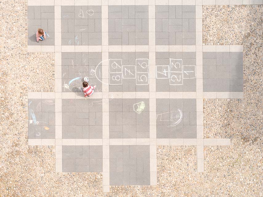 Un travail contemporain qui n'oublie pas le passé : une intersection entre des galets de rivière et des dalles de grand format BIG