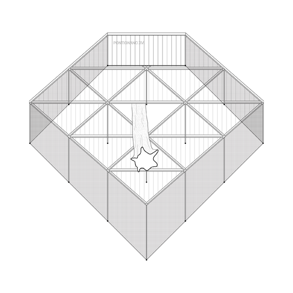 The pavilion is deprived of two of these triangular modules to make room for a central well in the cloister. A cypress also occupies a central position in relation to the pavilion