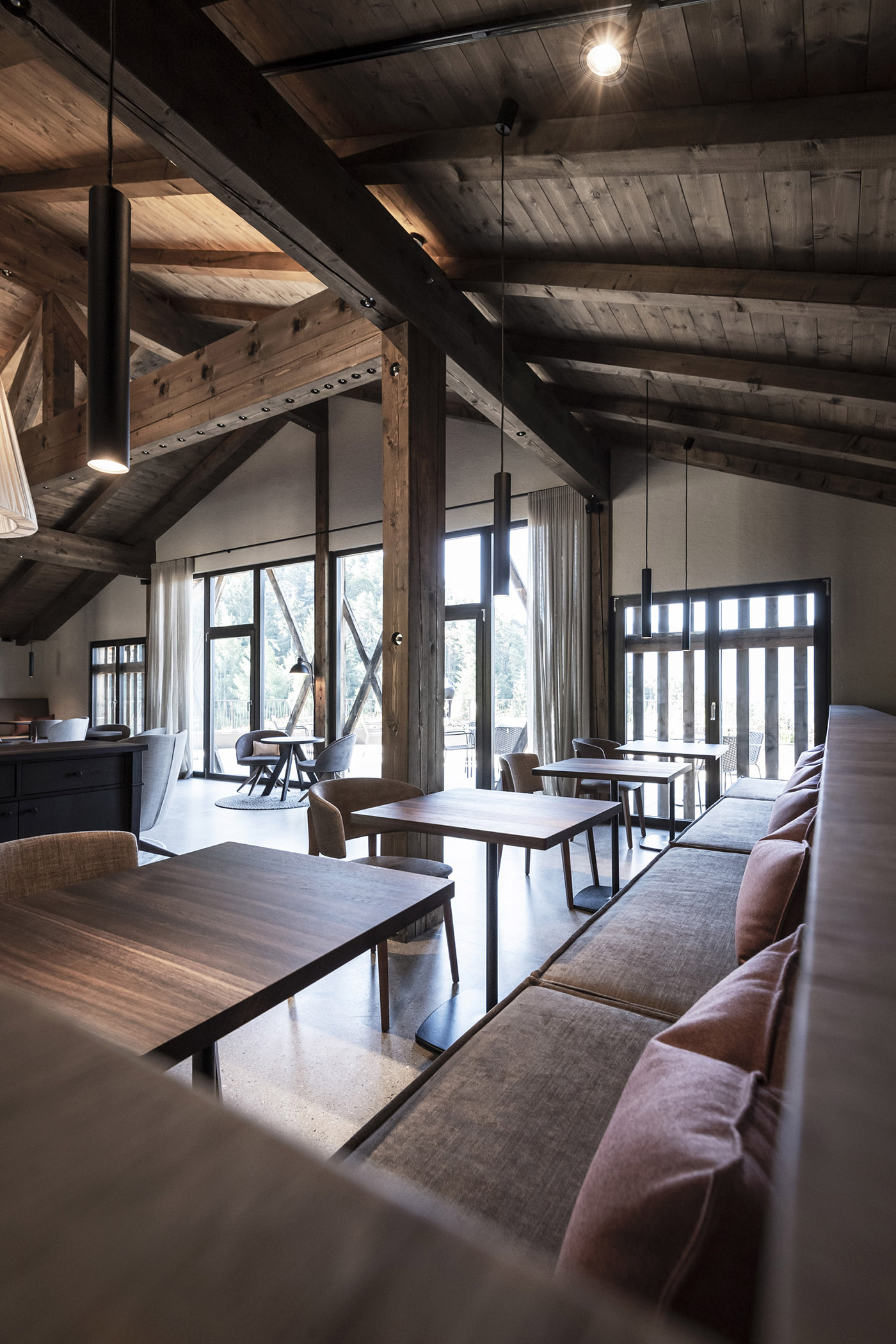 The large wooden truss under which the spaces are fluidly articulated has been reconstructed according to local tradition to restore the atmosphere of a typical South Tyrolean farmhouse