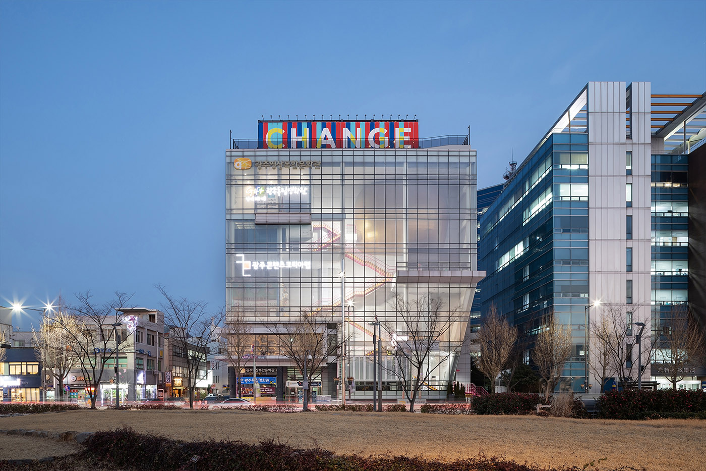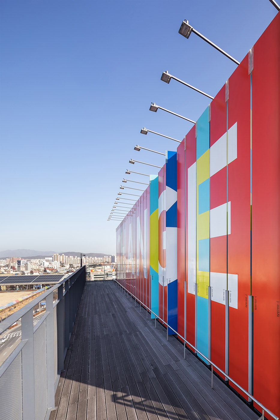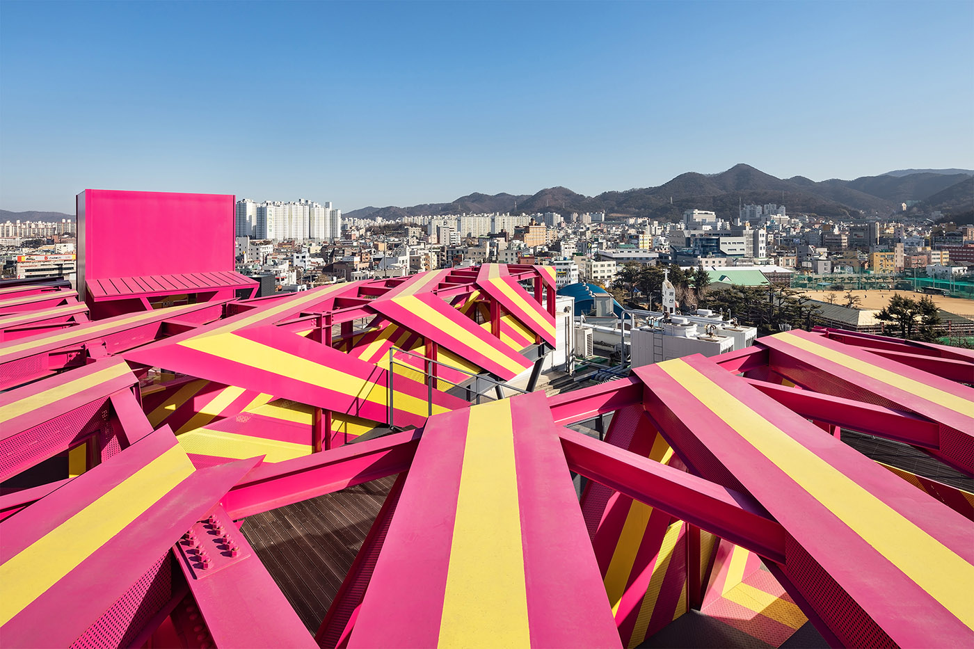 The installation Architecture of Autonomy by Berlin-based artist group realities:united, which is closely connected to the installation View Folly by architect Moon Hoon, defines the space, giving the architecture a visual identity recognizable from afar