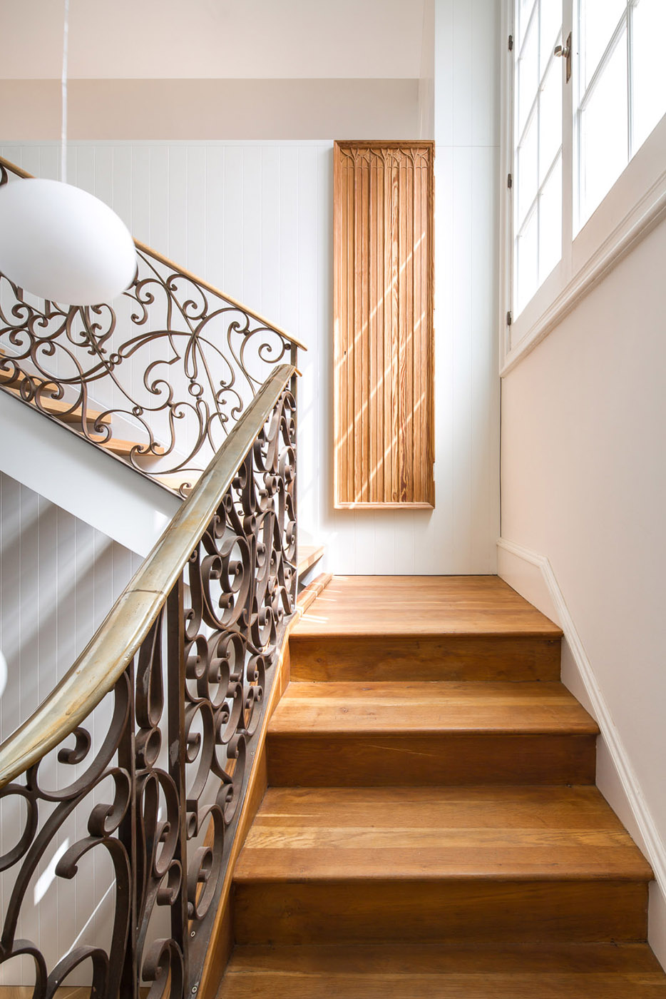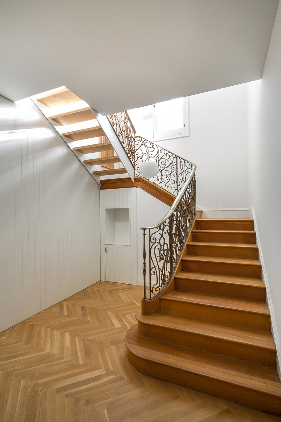 The design particularly highlights natural light and skylights that are added in less illuminated spaces. The project preserves a set of materials and furniture of great value and beauty, such as the cast iron staircase or herringbone oak parquet or carved wooden doors, all combined with contemporary design