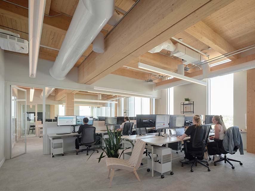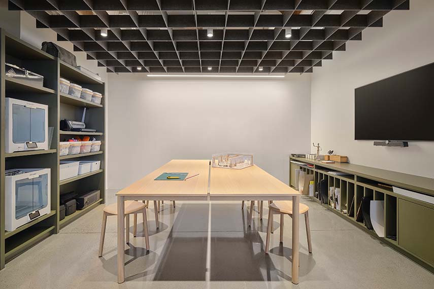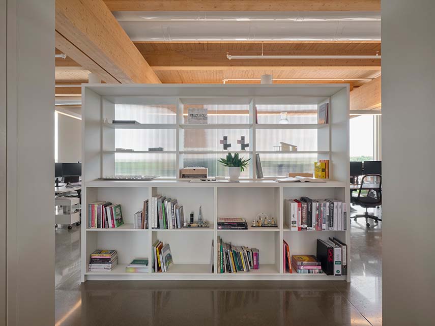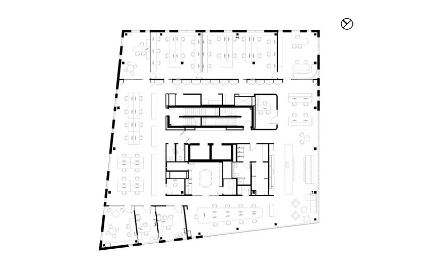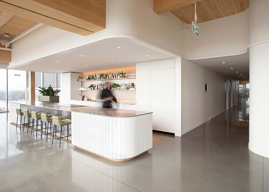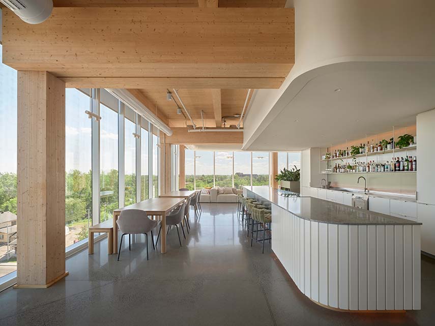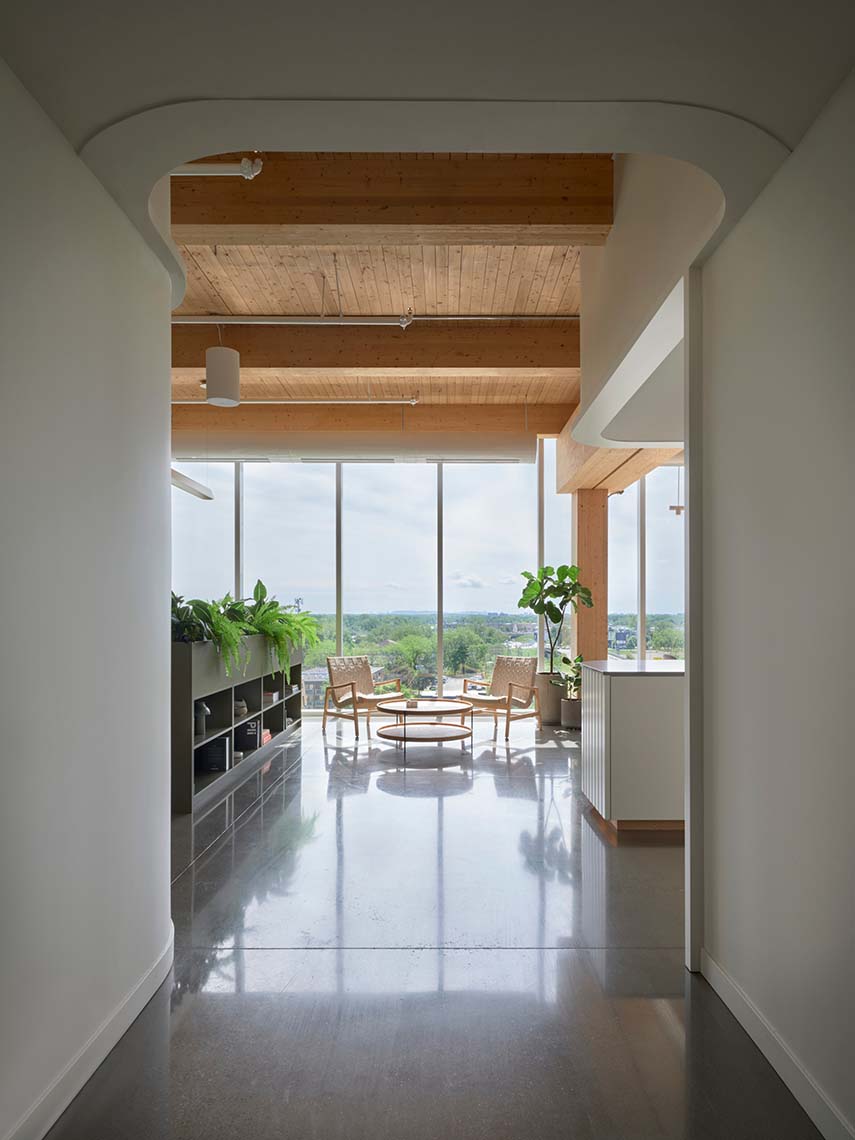 Les nouveaux Headquarters DKA se trouvent au 6ème étage d'un immeuble à Sainte-Thérèse, Canada. L'un des avantages du nouvel emplacement est le partage des salles de réunion avec toute la communauté de l'immeuble, un principe qui, dans les projets de bureaux, permet d'économiser des mètres carrés qui peuvent être dédiés au bien-être des travailleurs. DKA saisit l'opportunité en créant une entrée au siège offrant une vue magnifique sur les environs et menant à la grande cuisine équipée commune : un espace propice aux rencontres et aux échanges informels