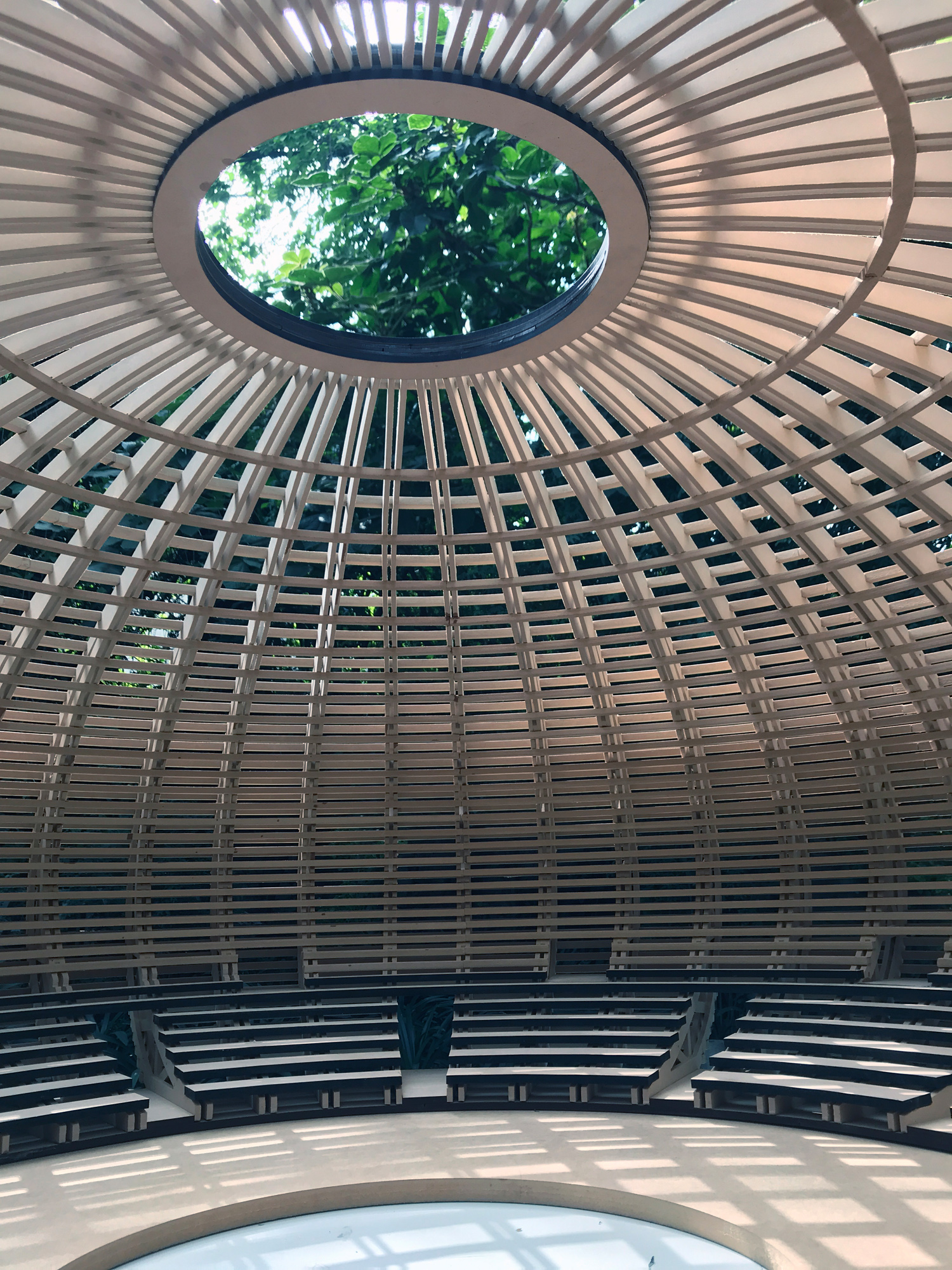 Circular temple for the Burning Man. Wooden trusses and rings that filter the light