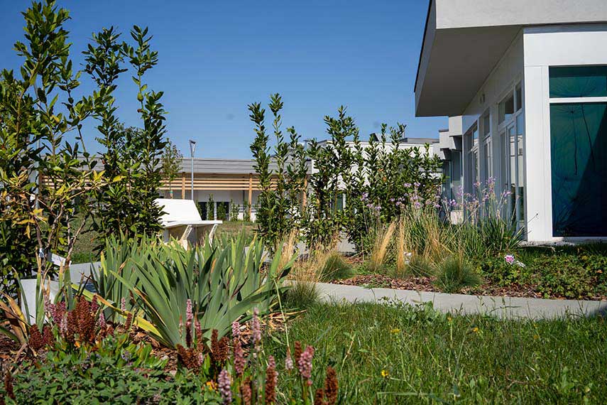 Les projets d'architecture du GBa studio sont basés sur la recherche d'un "style éthique"; c'est également le cas pour la conception de la Nuova Villa Bellombra qui prend en compte l'impulsion vitale qu'une architecture peut stimuler chez ses utilisateurs, essentielle dans le cas d'un hôpital, ainsi que l'impact énergétique du bâtiment sur l'environnement et le confort thermique et électromagnétique qu'il doit offrir. La bioarchitecture, la conception biophilique, la bioclimatique et la bioingénierie s'entrelacent dans cette structure de grande valeur humaine et environnementale