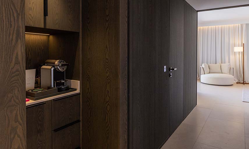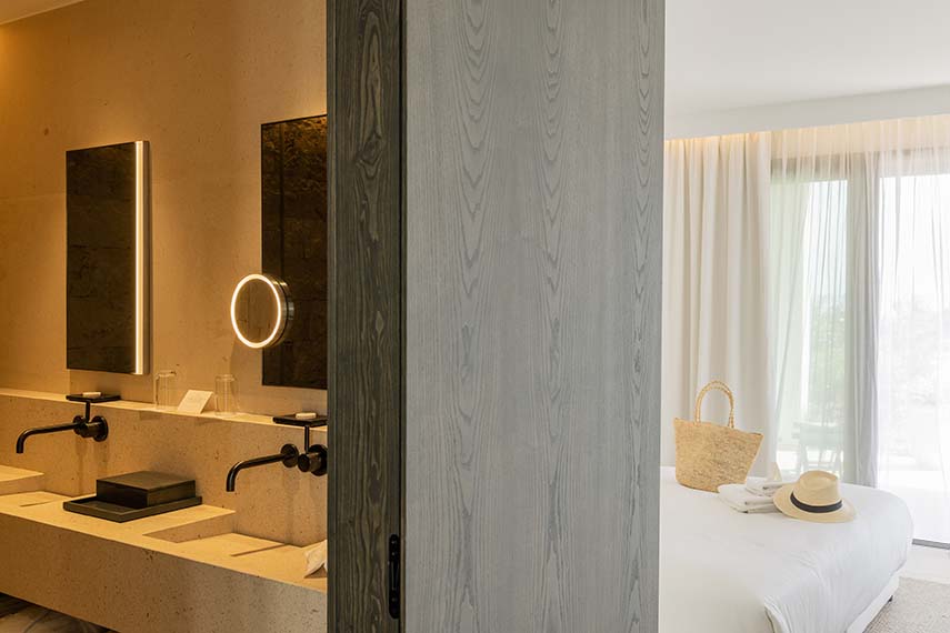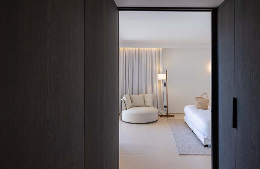 D’un style essentiel et frais mais à la fois luxueux et soigné dans les moindres détails, l'hôtel est conçu comme une grande résidence intime et discrète. À l'intérieur, les couleurs claires, blanc et crème des murs, des sols et des tissus dominent, en contraste avec des éléments en bois sombre et des inserts métalliques qui apportent une touche de raffinement à l'environnement