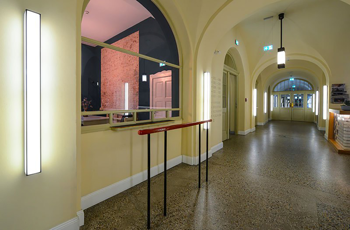 The conference rooms were originally used for the small bathroom and the shower cubicles were maintained in their original appearance. Many details of the old public bathroom have been preserved and bring the old days back to life. For example, the soap trays integrated into the wall are now used as pen trays. The construction of the restaurant, located in the old boiler room and the bar was very successful: the two gastronomic areas are very elegant and fit harmoniously into the overall design concept, thanks to the extreme aesthetic sensitivity of the architects
