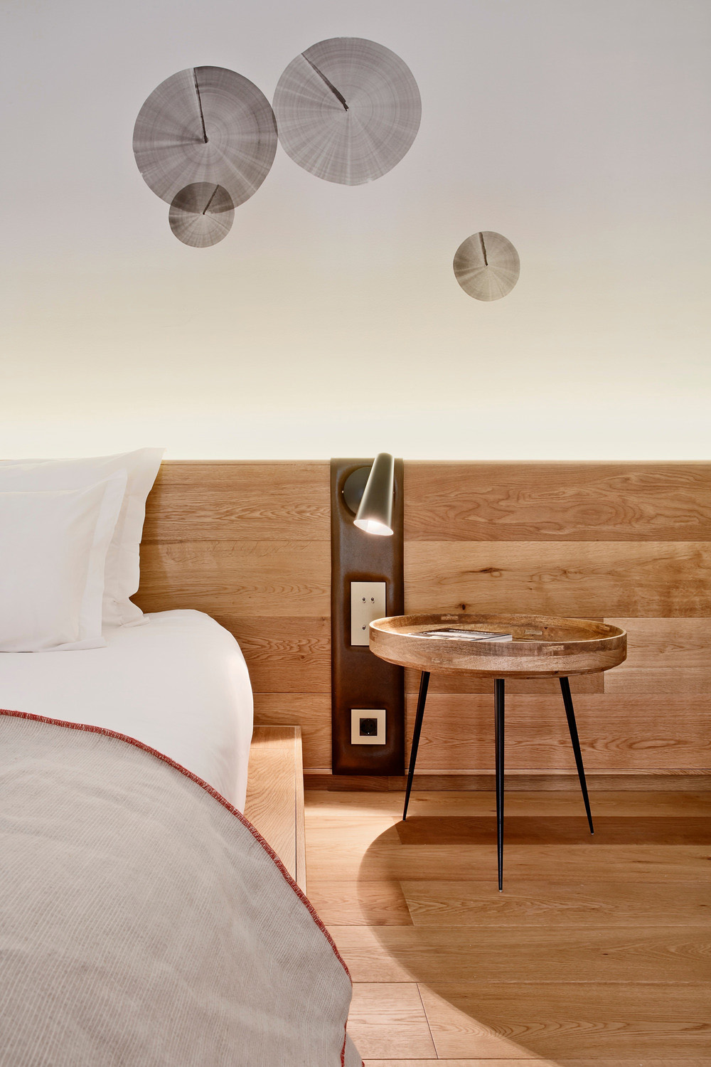 La maggior parte dei mobili è stata progettata appositamente da OHLAB per l'hotel. Letti, testate, panche, design semplici e puri si integrano nella stanza creando un'atmosfera lounge rilassata e confortevole. Oltre a questi mobili progettati, vale la pena sottolineare una serie di pezzi in bronzo invecchiato ispirati ai tradizionali carrelli in metallo utilizzati dai facchini, che sostituiscono i vecchi armadi, scrivanie, minibar e mobili di supporto