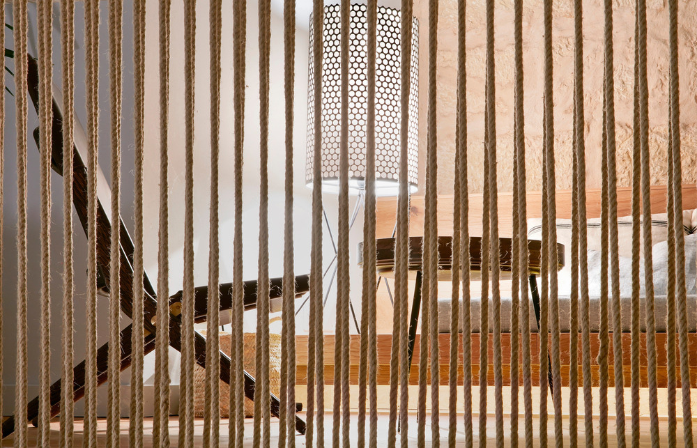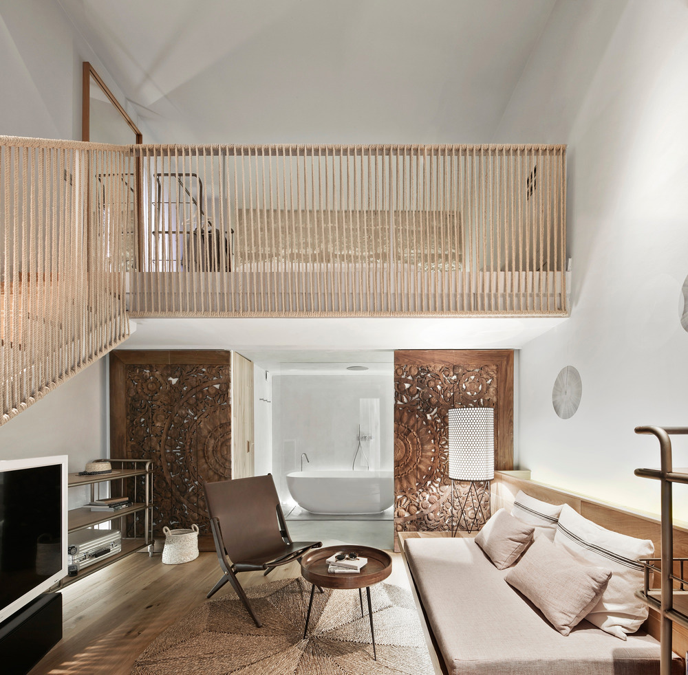 Puro est défini comme une oasis urbaine, cosmopolite et contemporaine mais avec des racines locales qui le rendent unique. Une palette simple de matériaux naturels est constante tout au long du projet: bois de chêne, éviers et murs de salle de bains en béton, murs en pierre de roche rénovés - la pierre calcaire traditionnelle utilisée dans l'architecture traditionnelle de Majorque, cordes de chanvre naturelles, interrupteurs et accessoires en acier inoxydable, cuir vieilli, lin, coton, tissus conçus par OHLAB et produits sur de vieux métiers à tisser majorquins pour l'ameublement, coussins et couvertures, tapis en raphia et paniers en osier produits localement, etc. De plus, les portes en bois massif mandala, qui ont été la marque de fabrique de l'hôtel depuis ses débuts, ont été rénovées