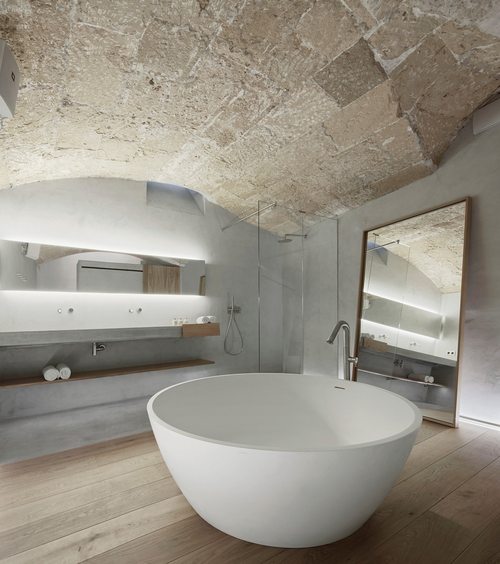 Un autre objectif important était la conception des salles de bains comme des espaces de plaisir, spacieux et intégrés aux chambres, avec des baignoires généreuses, sculpturales et autoportantes placées dans les chambres comme un autre meuble