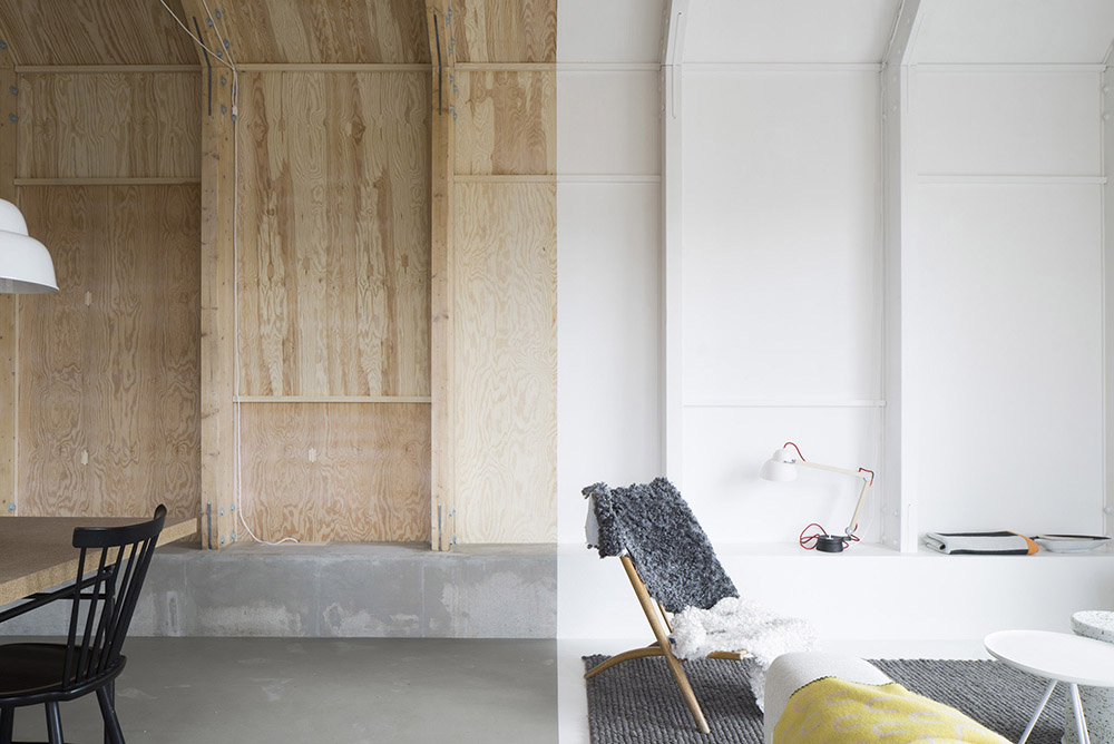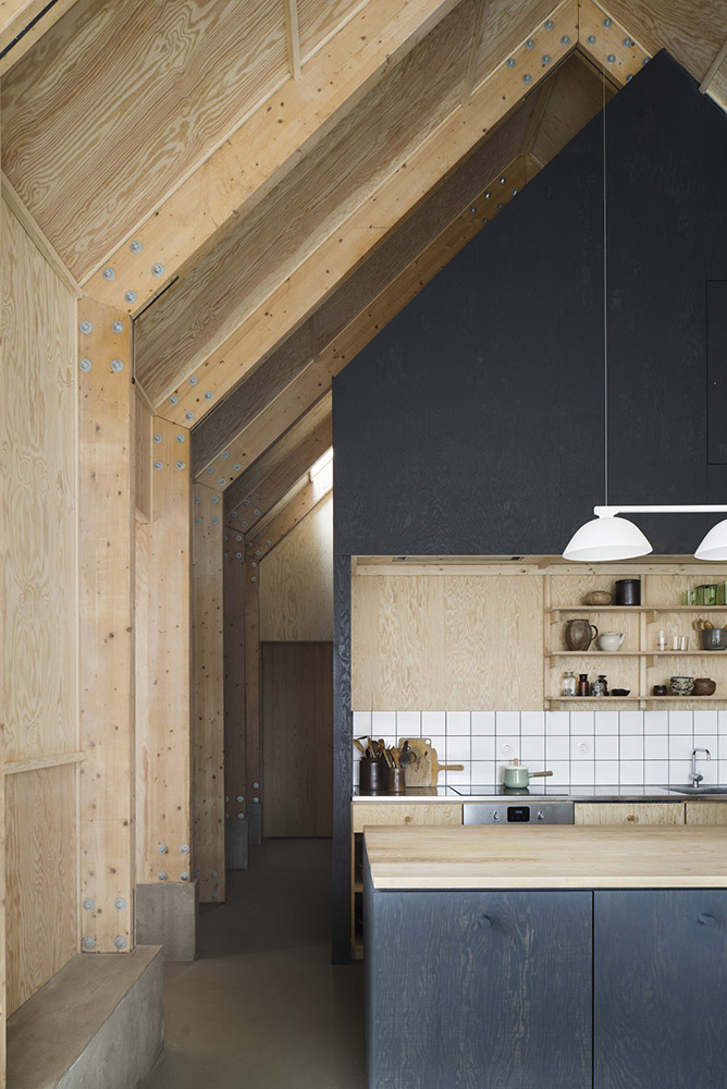 Wooden beams and trusses, along with plywood walls, add warmth to the interior. Concrete is used for the floor which is a durable and beautiful surface for everyday use. The house consists of two volumes which are spaced between them