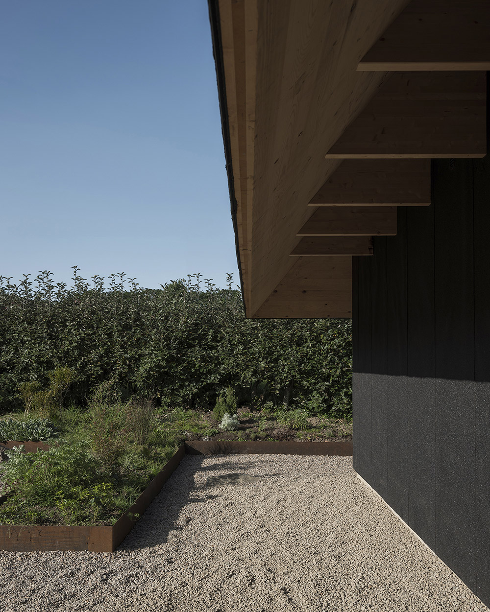 The contrast that is created between the interior and exterior is very interesting. The exterior of the walls and roof with its very large overhang is covered with a pitch black tar felt, which contrasts with the bright interior
