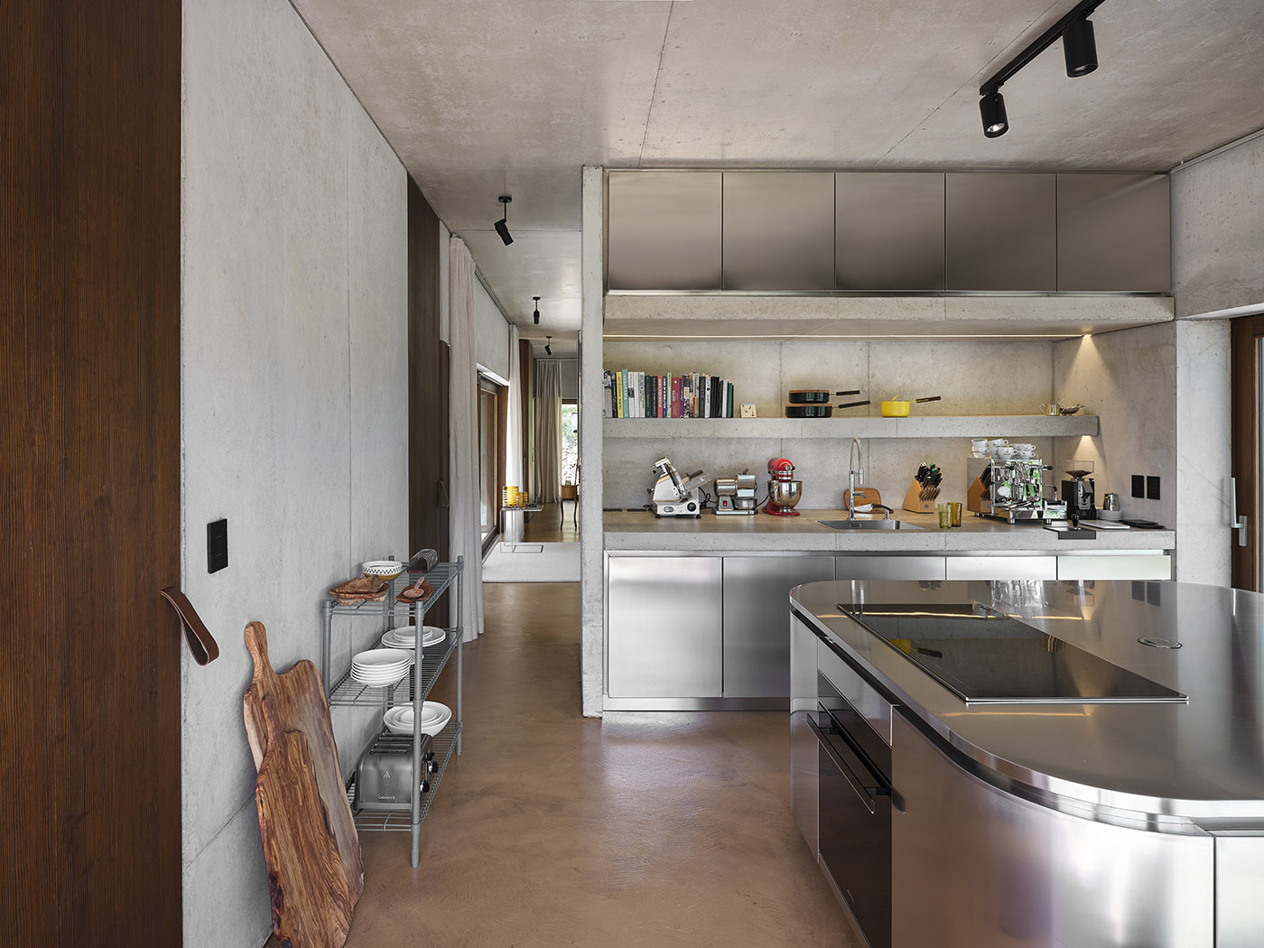 Une île en acier abrite la cuisine, qui, associée à la monumentale table en béton coulé sur place, autel laïque au centre de la scène visible depuis chaque pièce de la maison, célèbre le rituel de la bonne cuisine italienne en mettant en avant la convivialité de la résidence