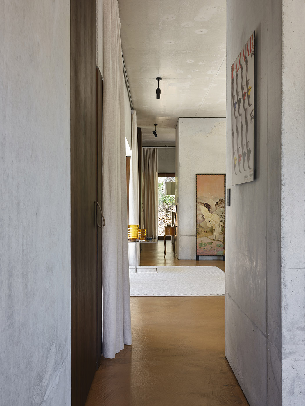 La résidence s'articule autour d'un patio central et se compose de huit boîtes structurelles reposant sur une base en béton qui supportent la grande toiture en pierre. Les intérieurs se caractérisent par la présence de matières brutes, le sol en résine de ciment arbore la couleur de l'herbe brûlée par le soleil pendant les mois les plus chauds et des feuilles de châtaigniers en automne. Le bois naturel complète les volumes ainsi que tous les éléments d'ameublement conçus sur mesure