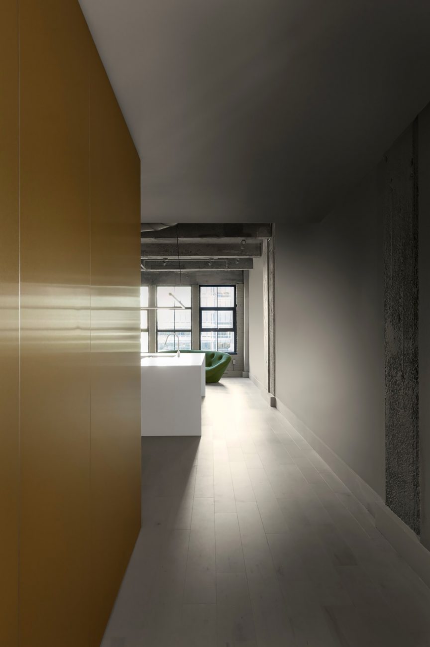 The grey tones of the raw materials are united in a volumetric entity perforated by an immense structure of gold that aligns to eliminate the sequence of spaces. Providing images evolving towards abstraction, this golden ribbon, which contains domestic functions as a storage unit, breaks up space in a single operation of powerful efficiency