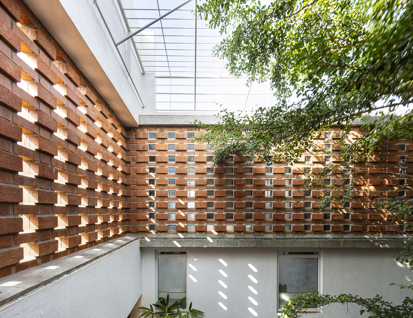 Brick walls run through the house, structuring transitions and overlaps. Their punctuated light patterns combine with the light pouring through the treetops to bring the house to life. The interior becomes a space in which to be in touch with oneself, away from the superficial aspirations of the outside. Inside Out House attempts to move away from the imaginary and the tangible that has taken over our lives today, bringing the inner self to life