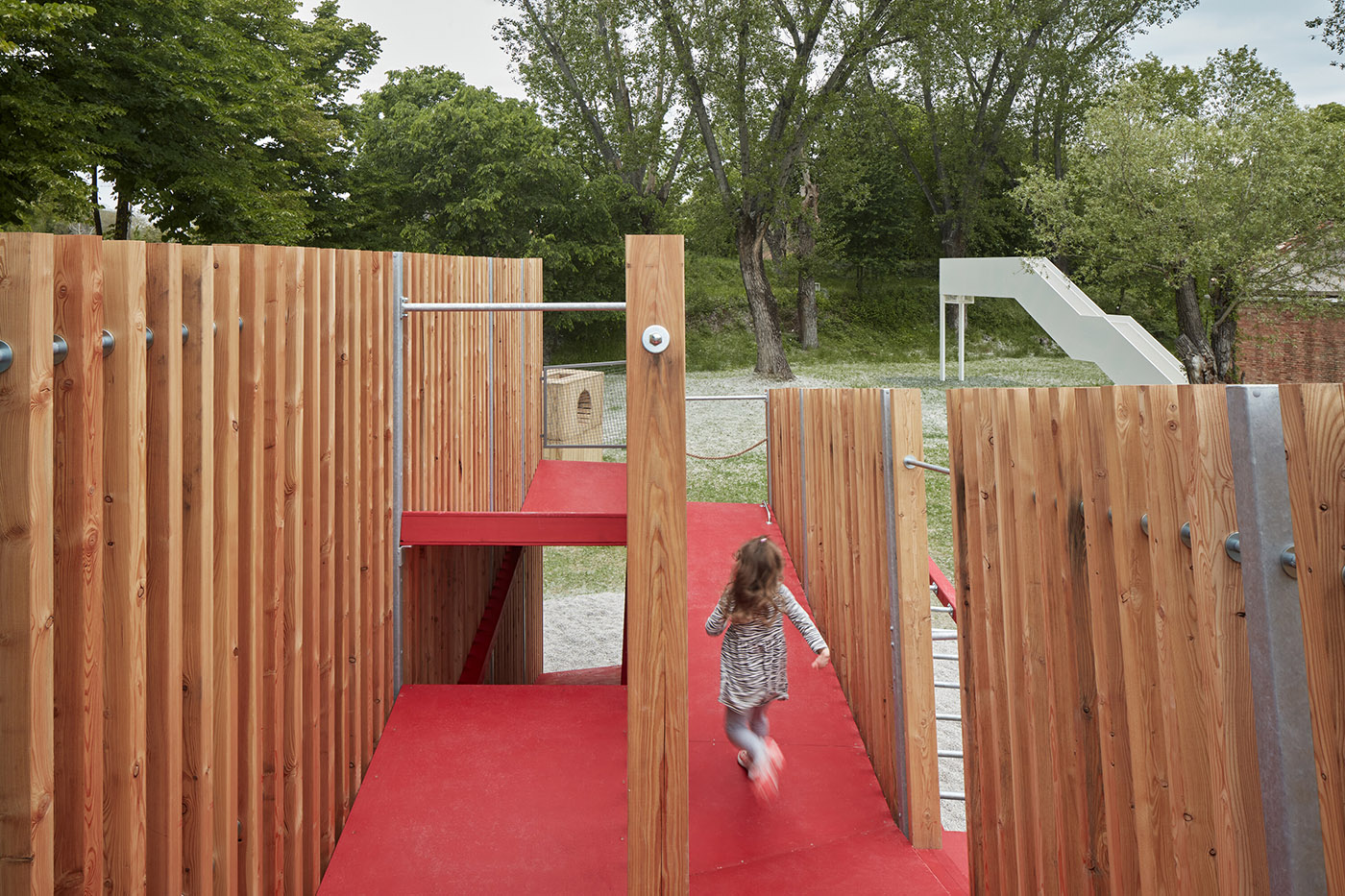 "À travers le jeu, nous franchissons un pas audacieux. Nous guidons le dynamo du changement par notre propre initiative. Le jeu est un début de changement. En pénétrant dans le corps physique de l'obstacle, les visiteurs se surpassent", déclare Hájek. L'installation se compose de quatre "clôtures" faites de profils en bois de mélèze, qui s'inclinent progressivement loin de l'axe vertical. Les "clôtures" sont reliées par des plateformes inclinées, qui permettent le mouvement le long de l'élément de jeu