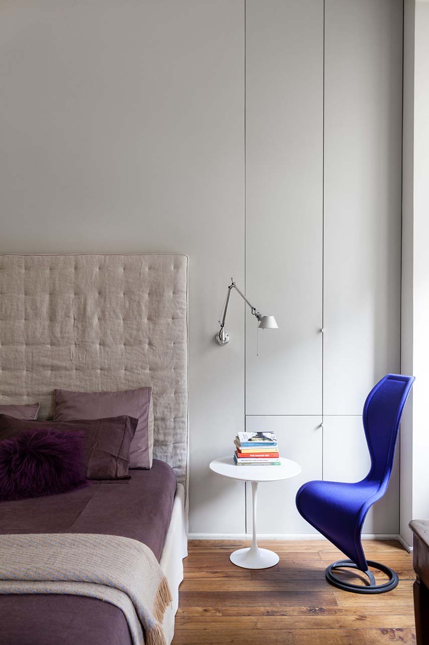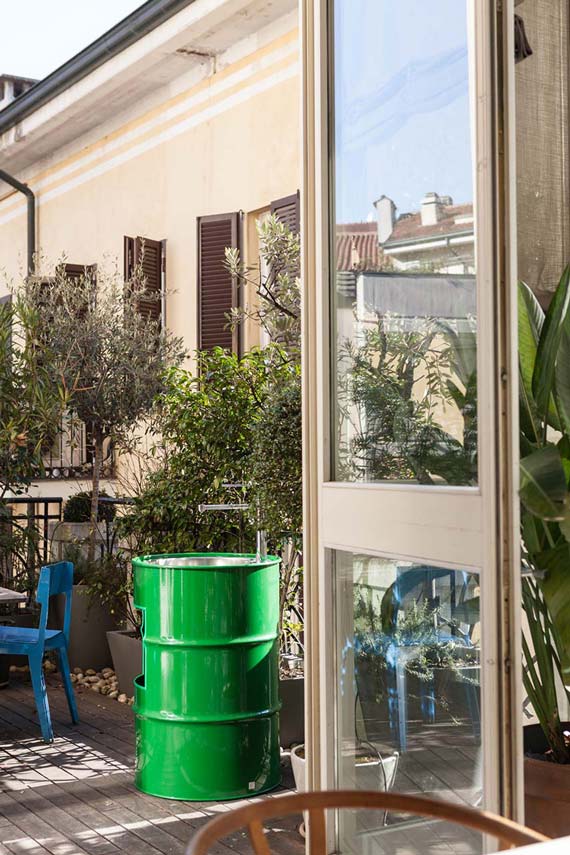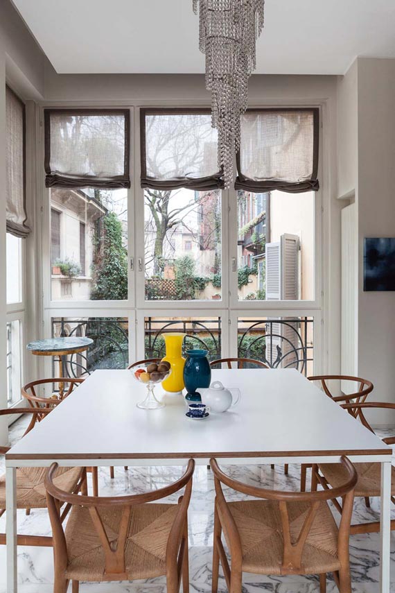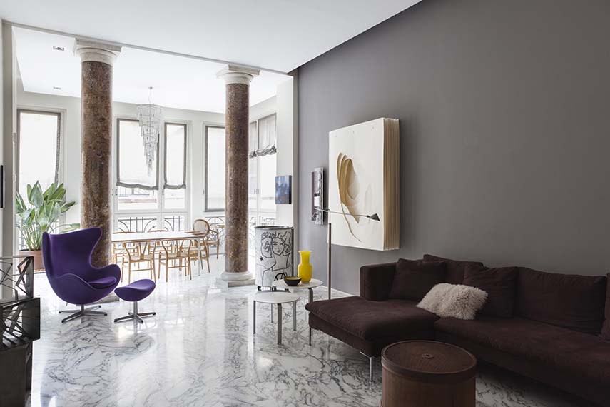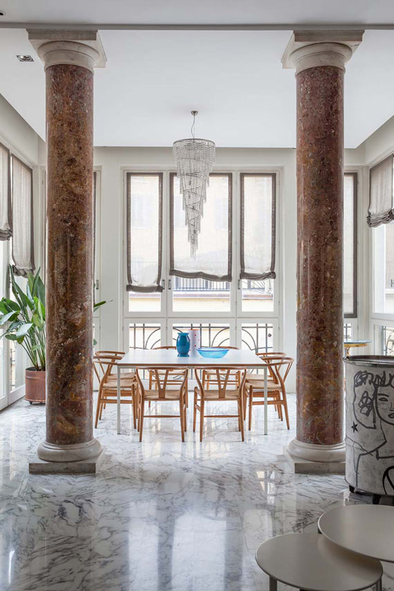 Sans aucun doute l'un de ses projets de design d'intérieur les plus chers, Francesca Cutini s'occupe personnellement de sa Maison de l'Architecte en pensant à la définition parfaite pour cet espace milanais rendu exclusif par les finitions de qualité, la double paire de colonnes, la grande baie vitrée et la terrasse : "le charme discret de la bourgeoisie". Initialement tentée d'alléger l'esthétique en peignant en blanc les colonnes en marbre rouge de Vérone et en réalisant un sol en résine à la place du marbre de Carrare, elle décide finalement de conserver le style original