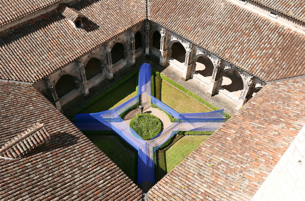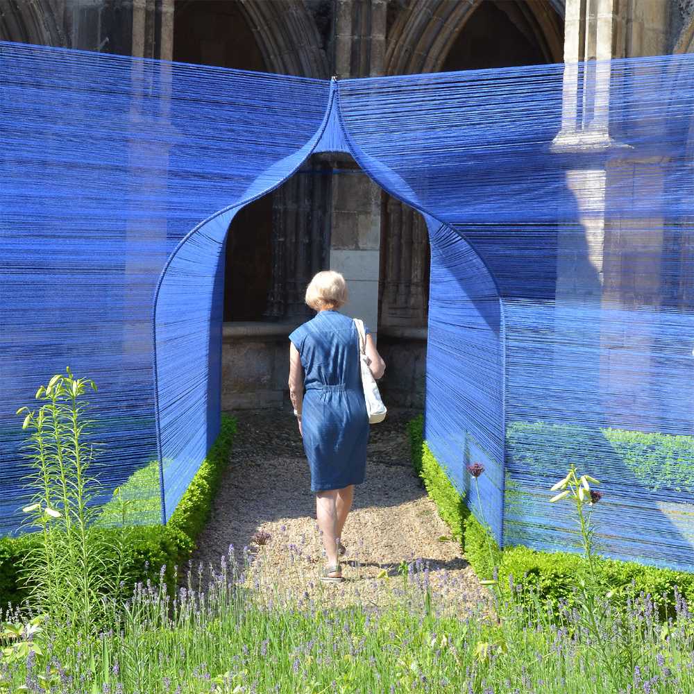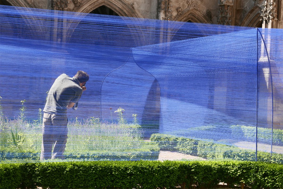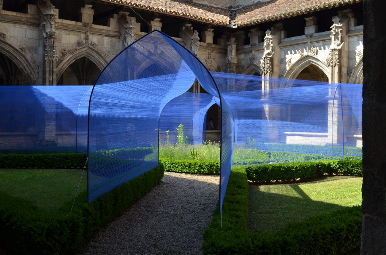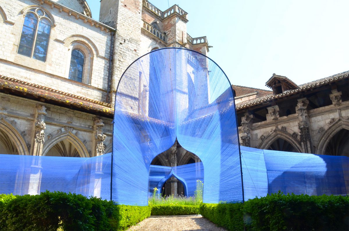 Au centre du cloître de la cathédrale, les volumes câblés et transparents se déploient sous le regard des passants curieux.