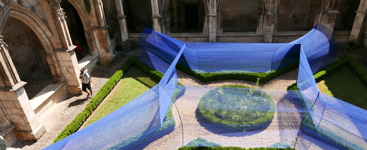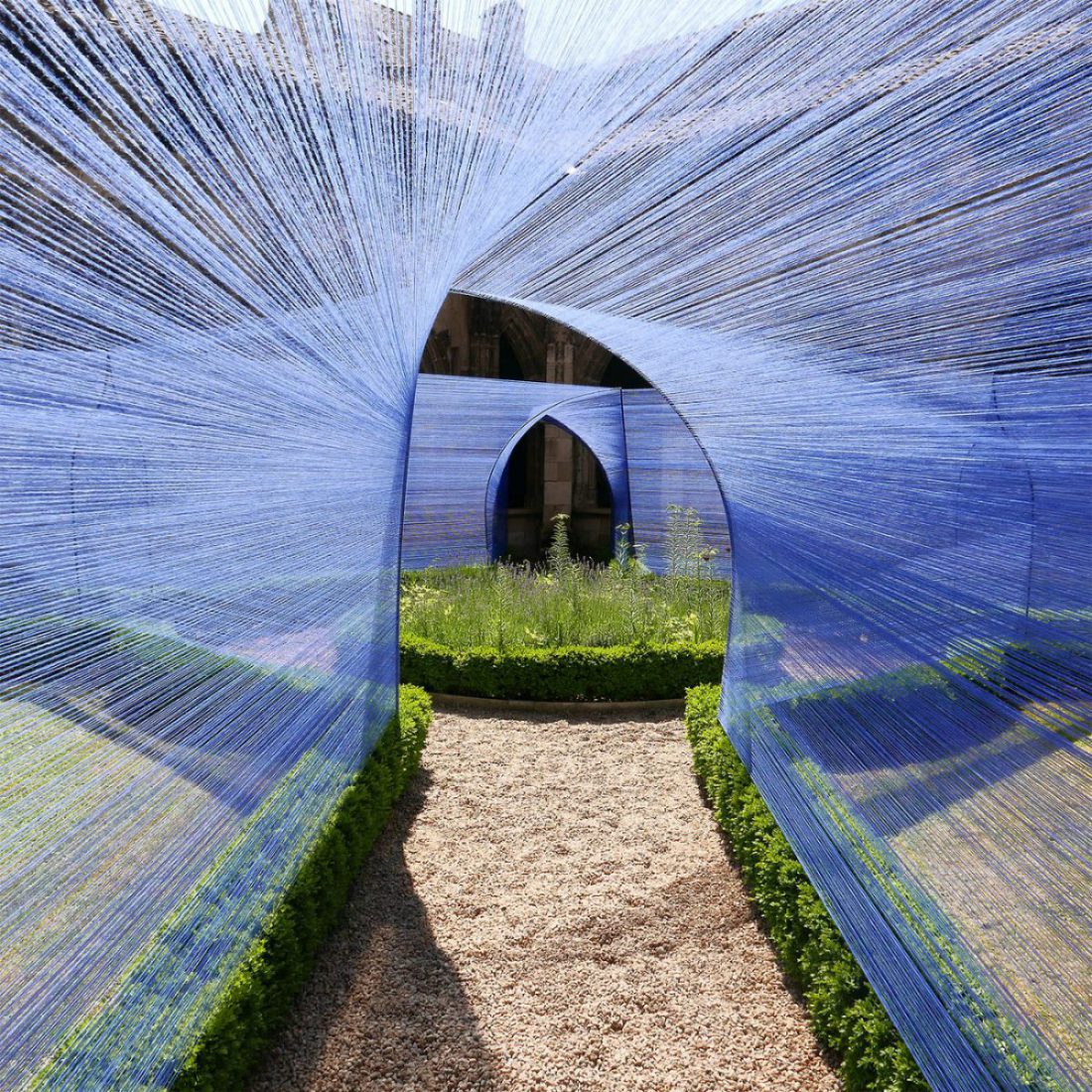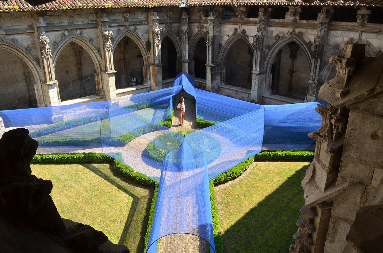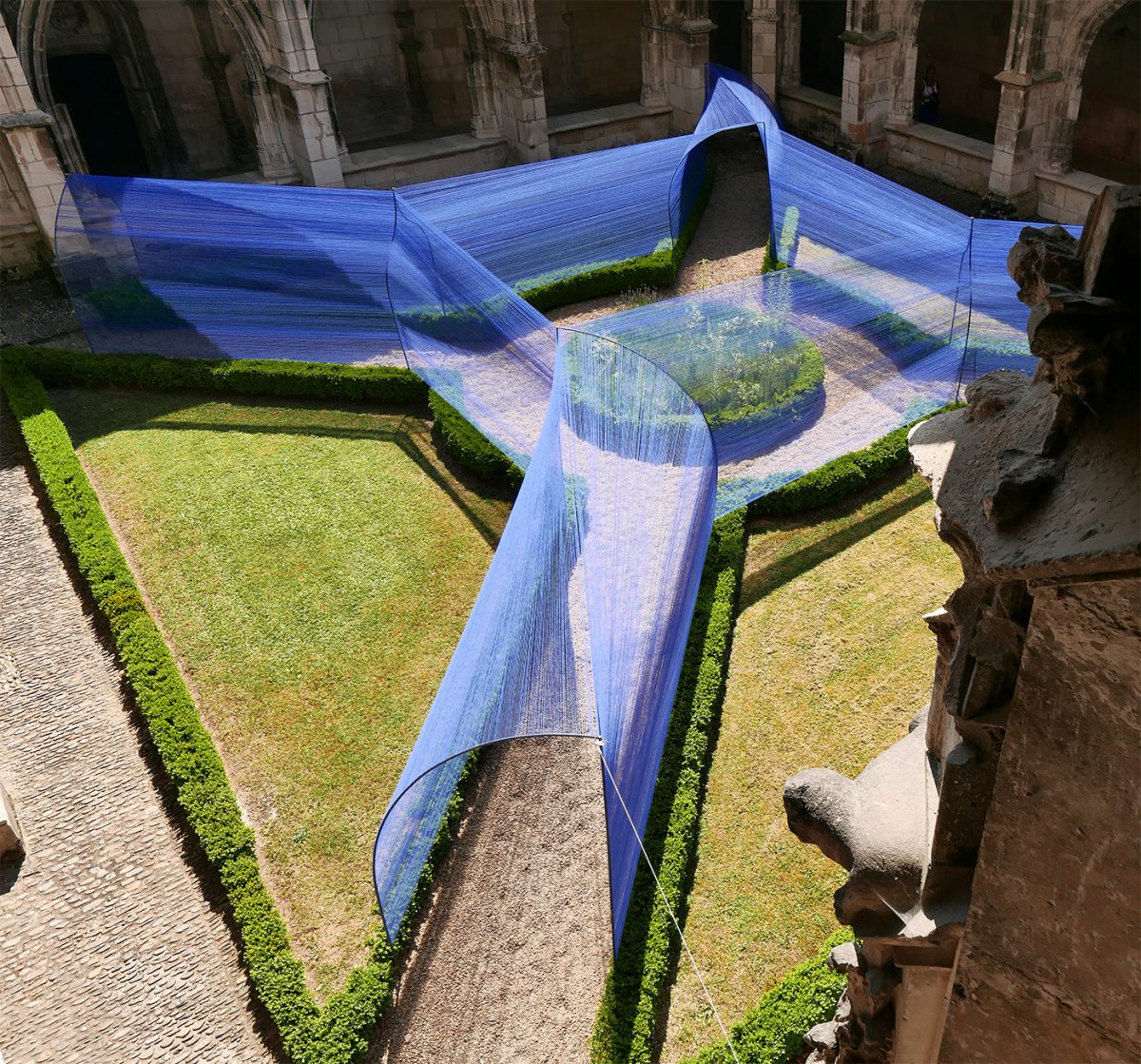 Au centre du cloître de la cathédrale, les volumes câblés et transparents se déploient sous le regard des passants curieux.