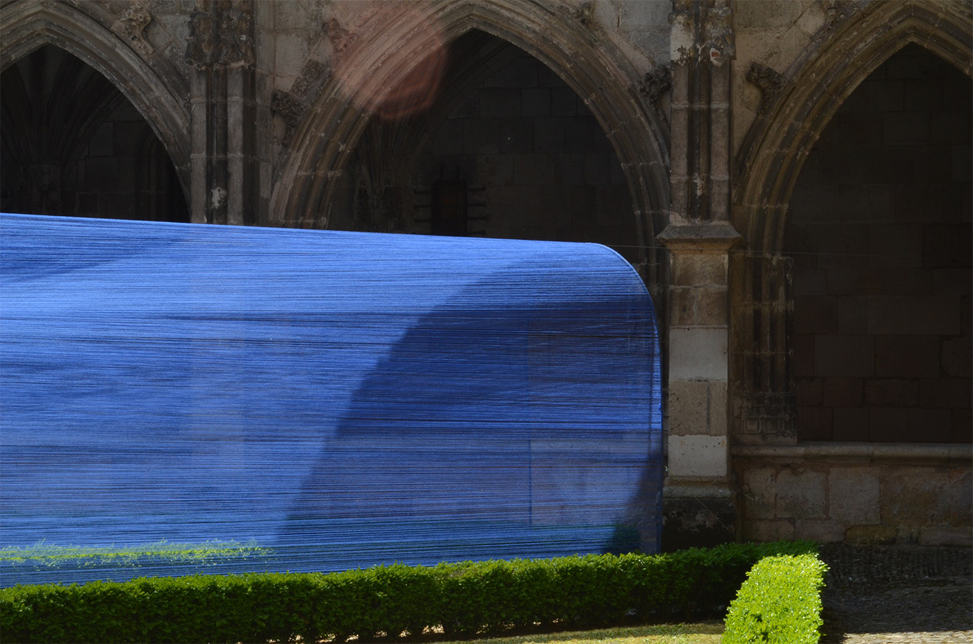 Les arcs de toutes origines sont ici reliés par une structure tissée colorée qui se fond avec la lumière et le mystère; révélant par la suite une architecture dématérialisée, lumineuse, dont les variations sont ressenties par le passant lorsqu'il marche sous les voûtes. De ces fils suspendus d'Ariane, le marcheur est guidé vers le cœur de l'intrigue, un cloître secret.