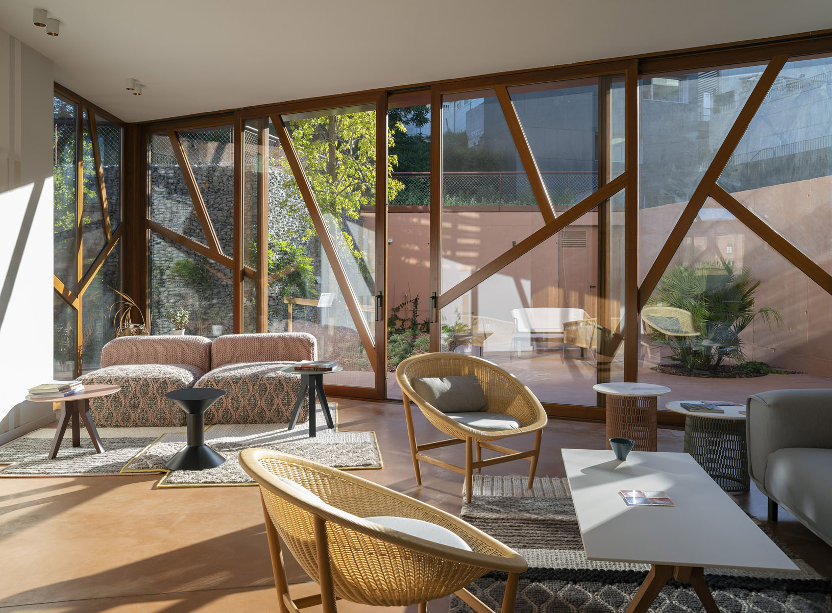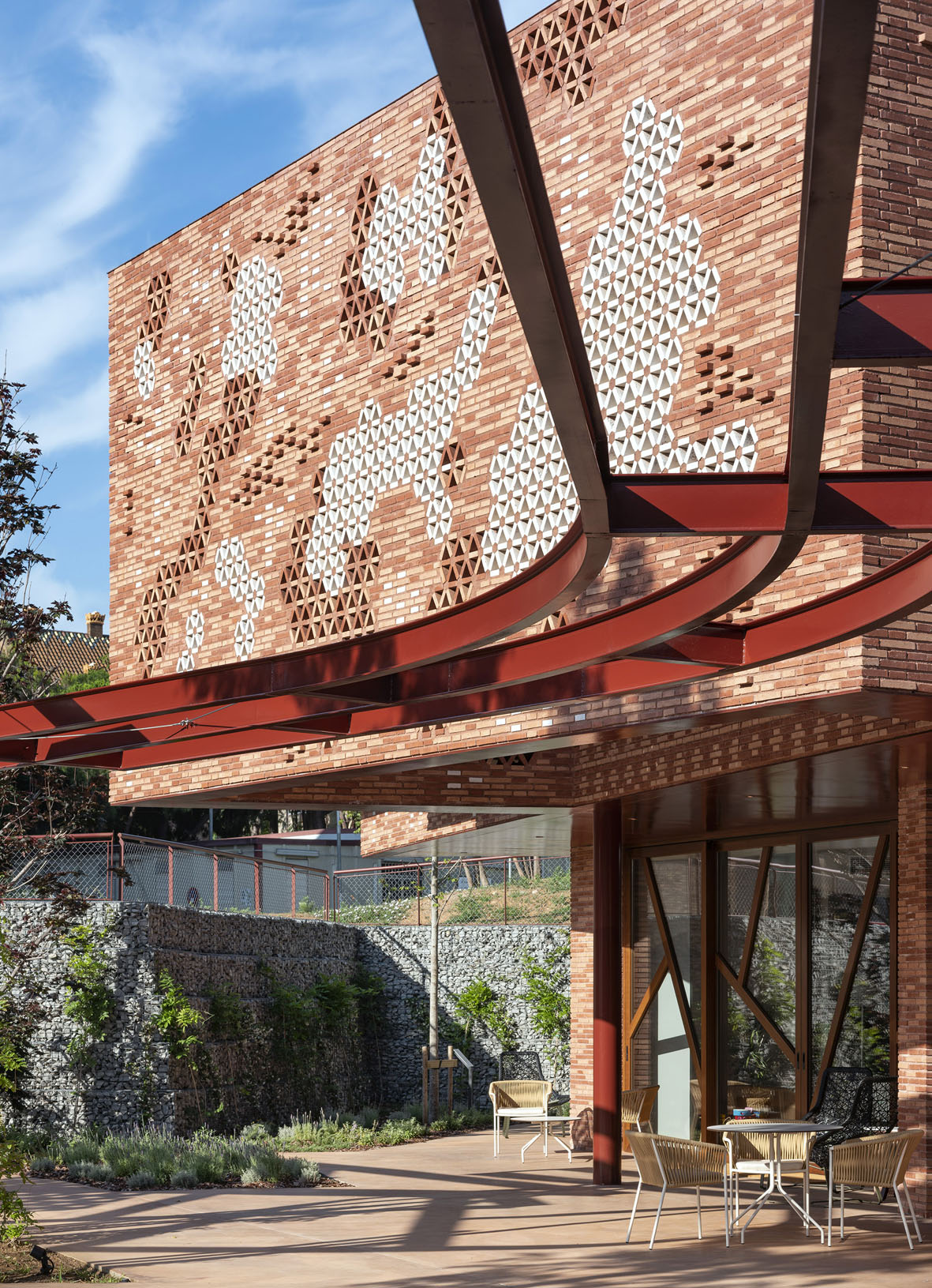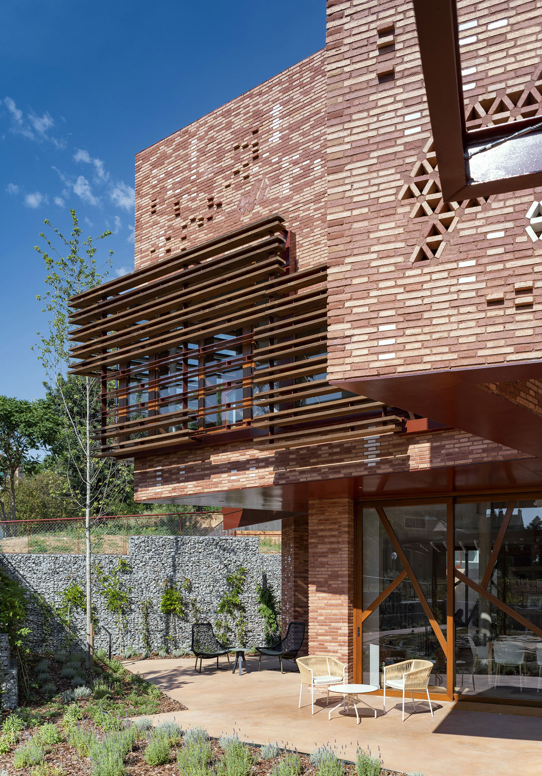 The wall becomes a ceramic lattice to filter the Mediterranean sunlight, focus the view of the environment, promote air circulation and protect the privacy of the interior spaces.The entire project was inspired by the richness of materials, textures, colors, geometries, patterns and greenery of the original hospital complex