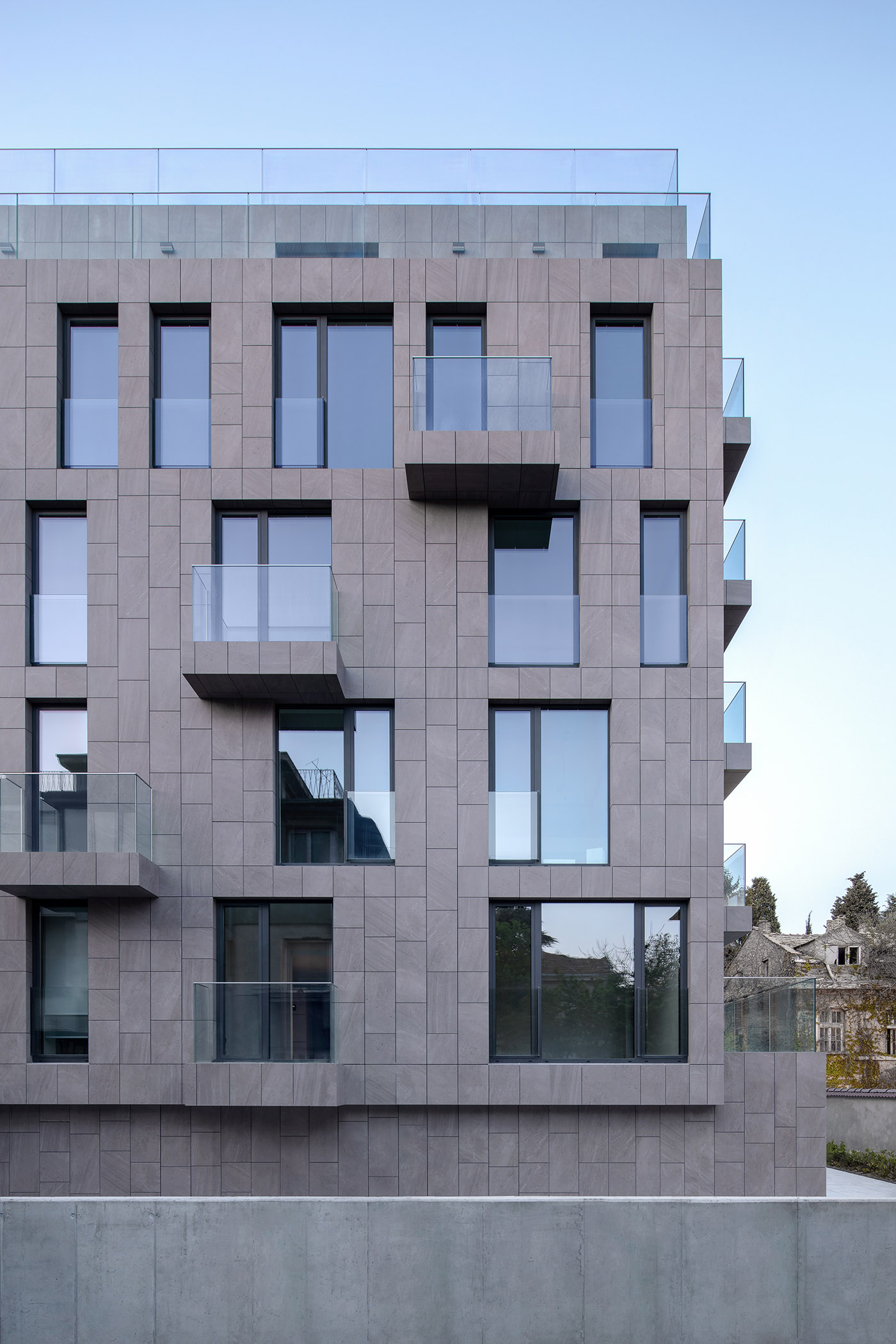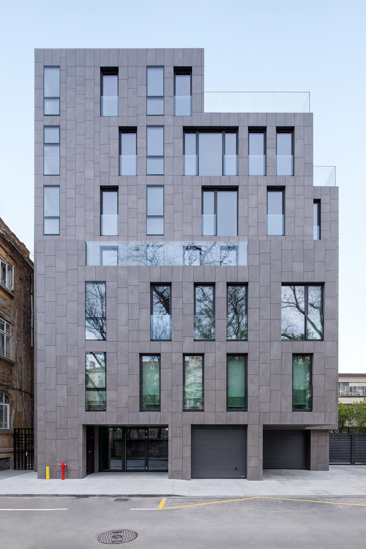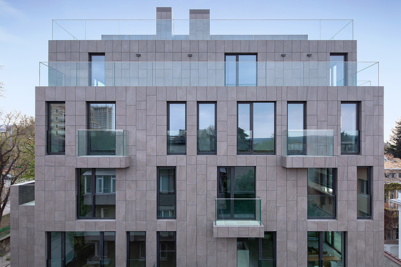 Bordering the Sea Garden and the Black Sea the KR Apartments residential building is located on a small lot on a quiet street with minimal slope. The building is terraced toward the east facade, where the reconstruction of the historic annex building is planned