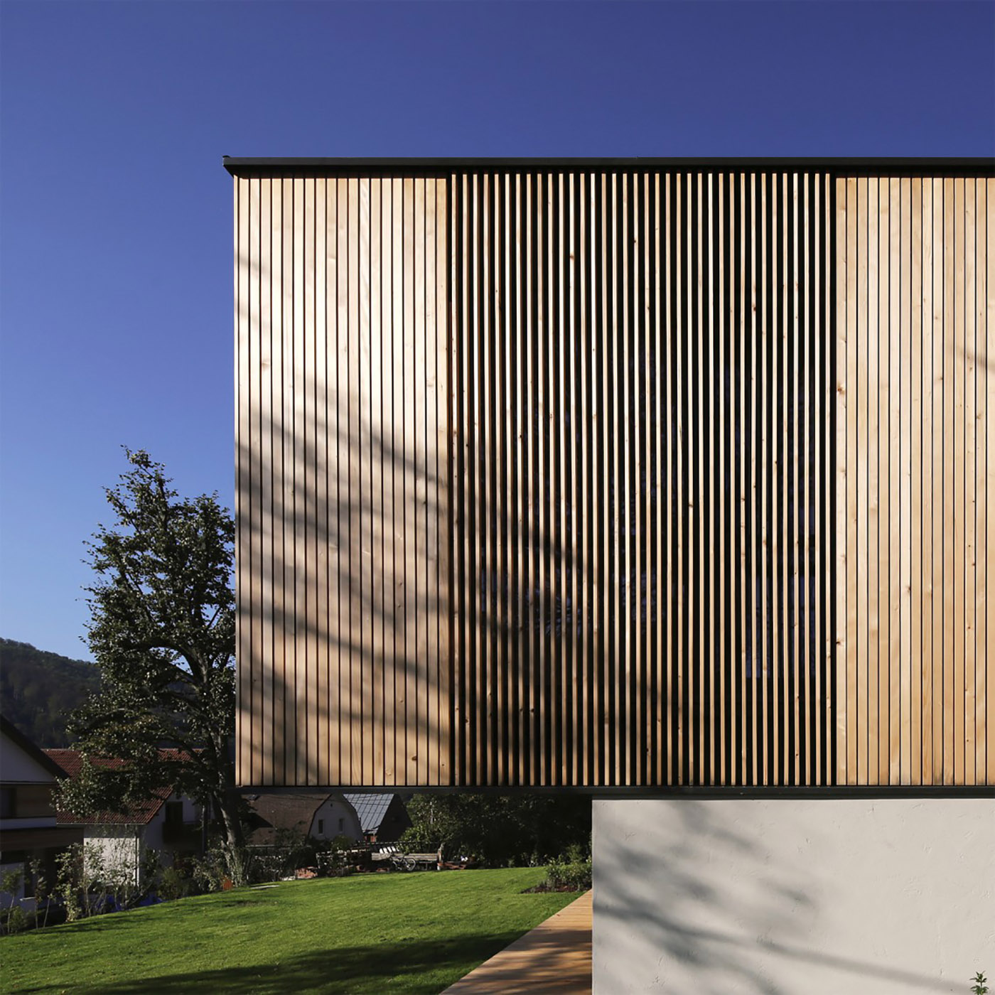 L-House in Purkersdorf. Spruce slats cover the building and frame the landscape