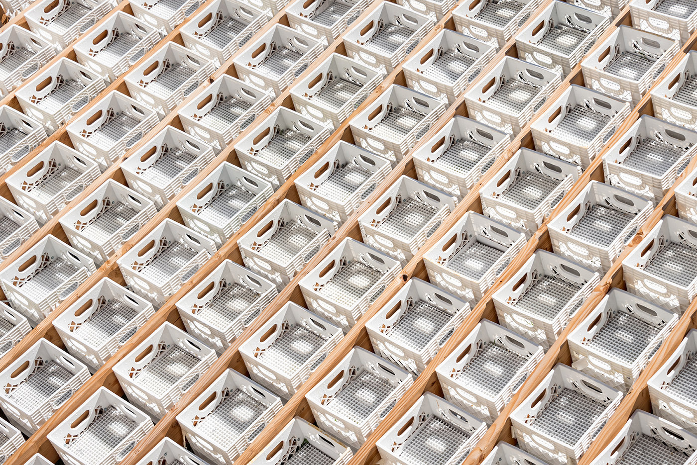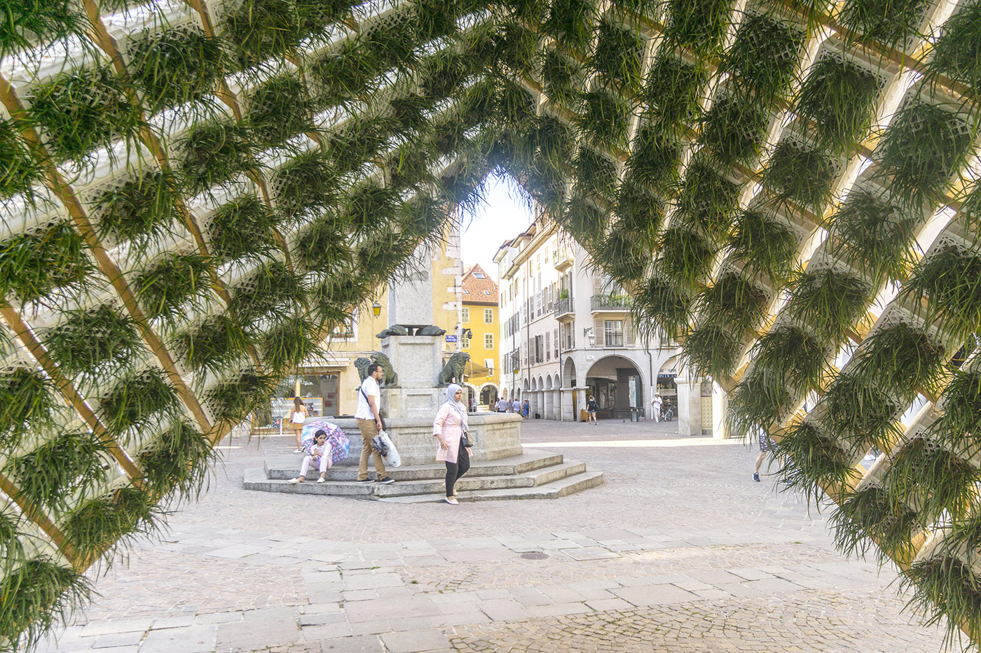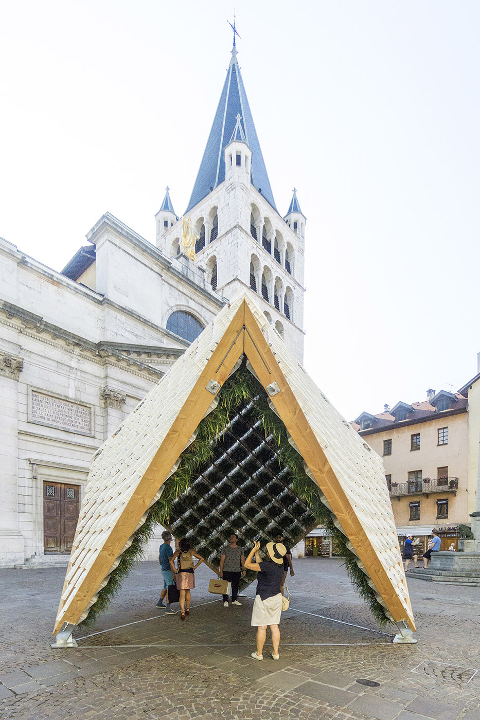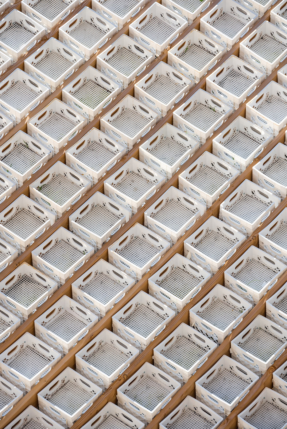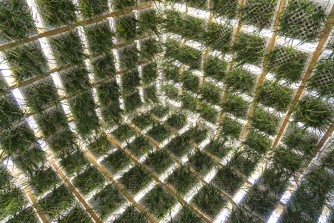 Le pavillon conçu par Behin Ha Studio présente une structure en bois ouverte sur trois côtés, et utilise un système modulaire de caisses en plastique pour soutenir les plantes en hauteur et permettre leur croissance, même après le démontage du pavillon.