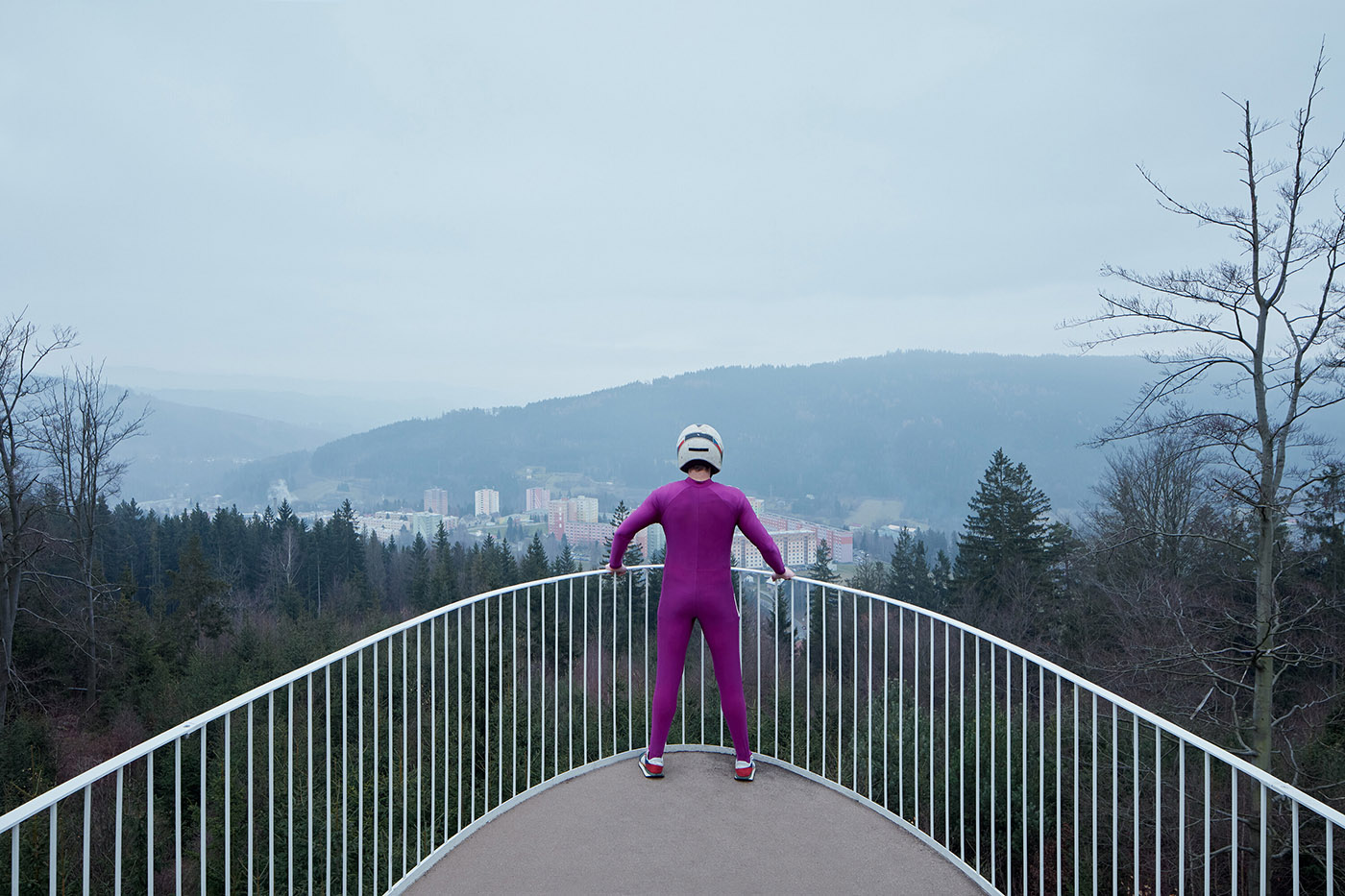 L'architecture du belvédère se compose de trois fines jambes en acier et d'un ventre brillant qui reflète le granit, les arbres, les gens et le ciel. Le belvédère, accessible par un escalier, offre une vue sur Tanvald et les montagnes environnantes. L'image réfléchie à la surface incurvée ci-dessous est déformée, les couleurs et les reflets se confondent