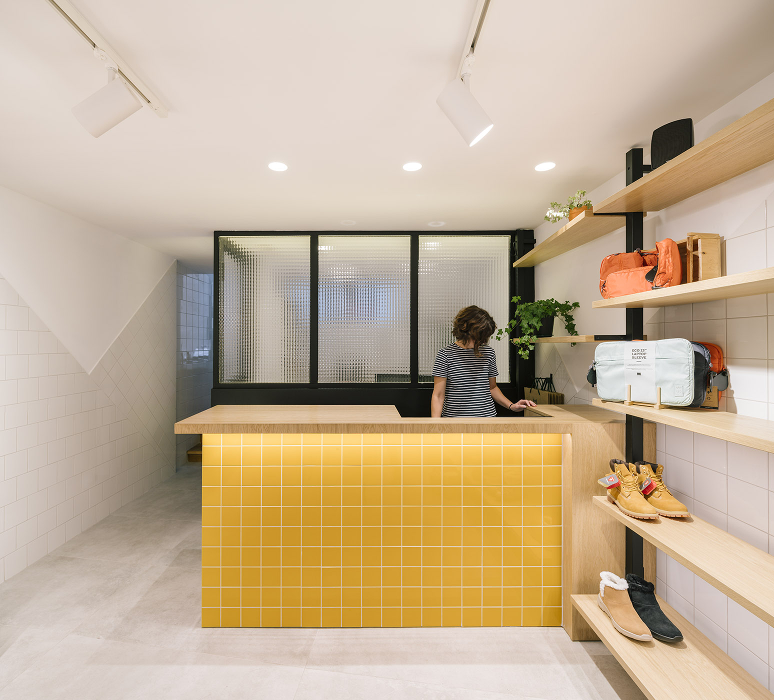 The counter appears as an element of continuity of these ceramic risers and of wood tiles. The touch of color is added through the mustard tone of the tiling. From the outside, the storefront highlights the double height of the space; filling the upper part of the space are flourishing plants. The feeling of height is reinforced by the pillar that picks up the mustard color of the counter