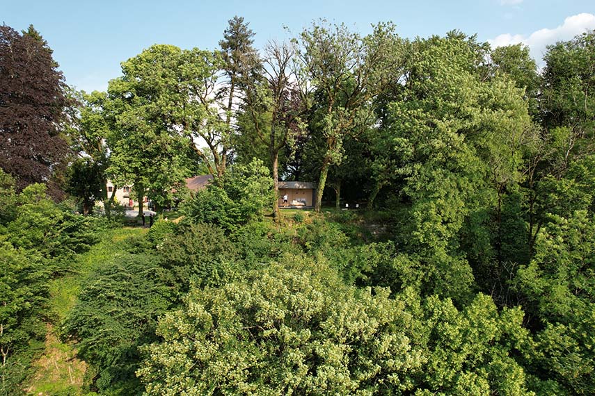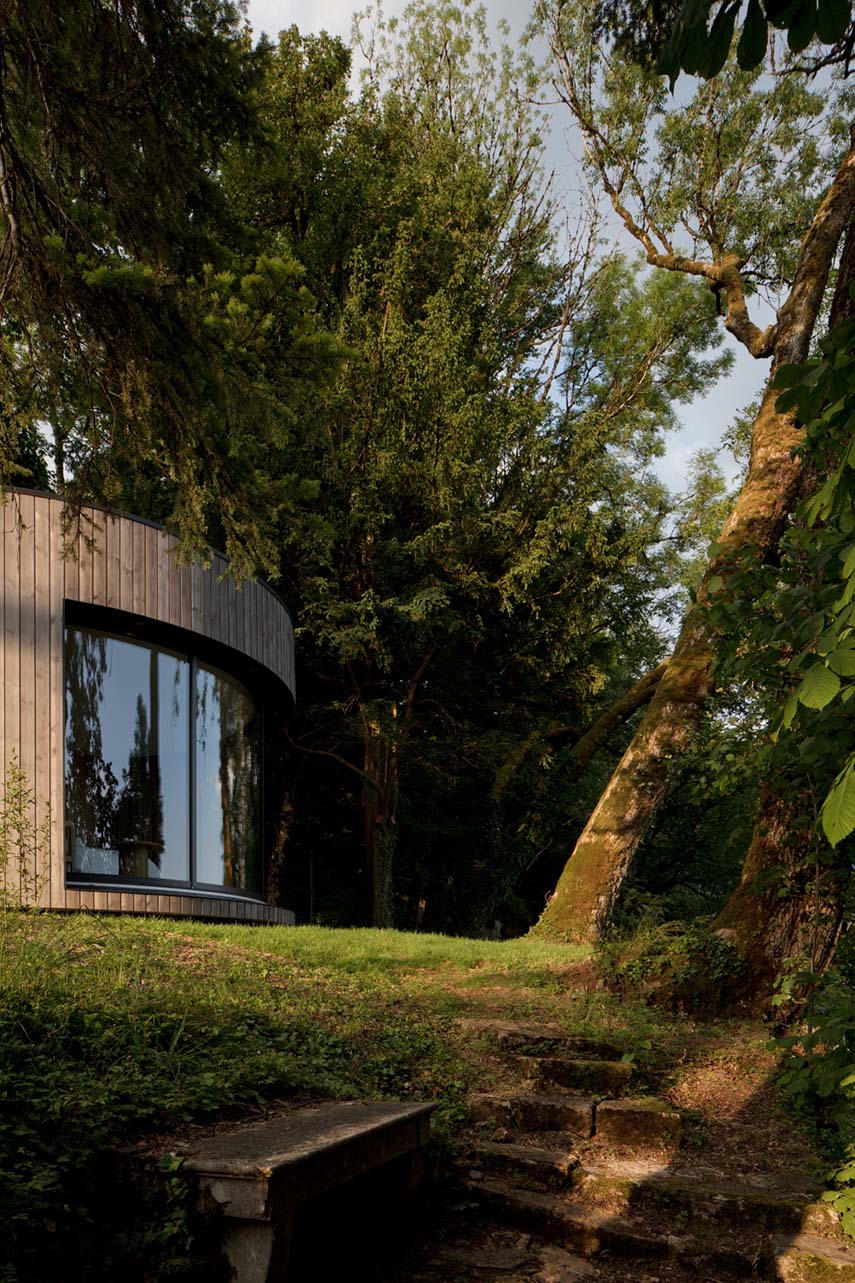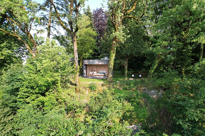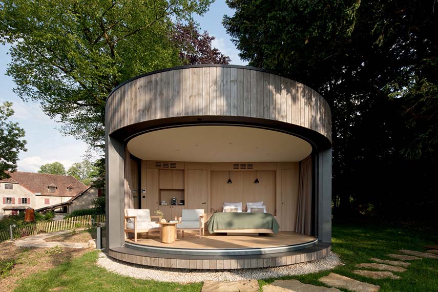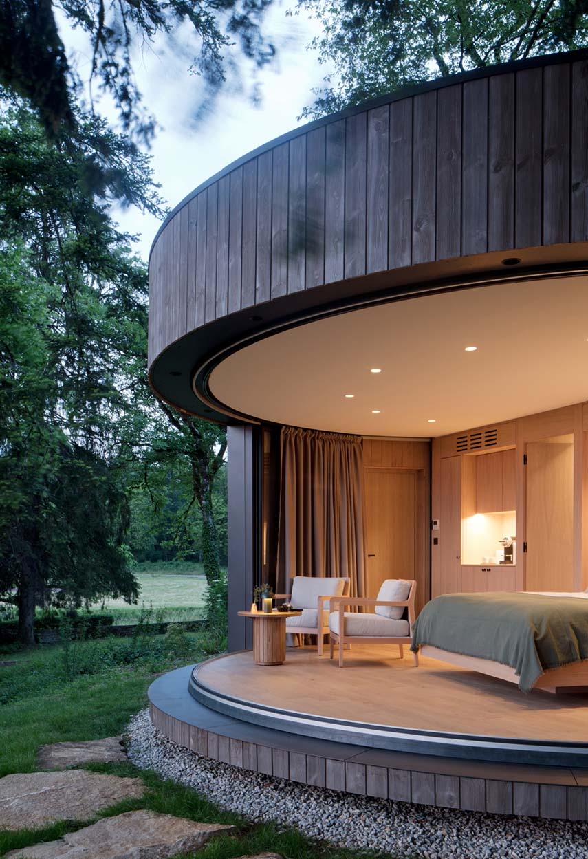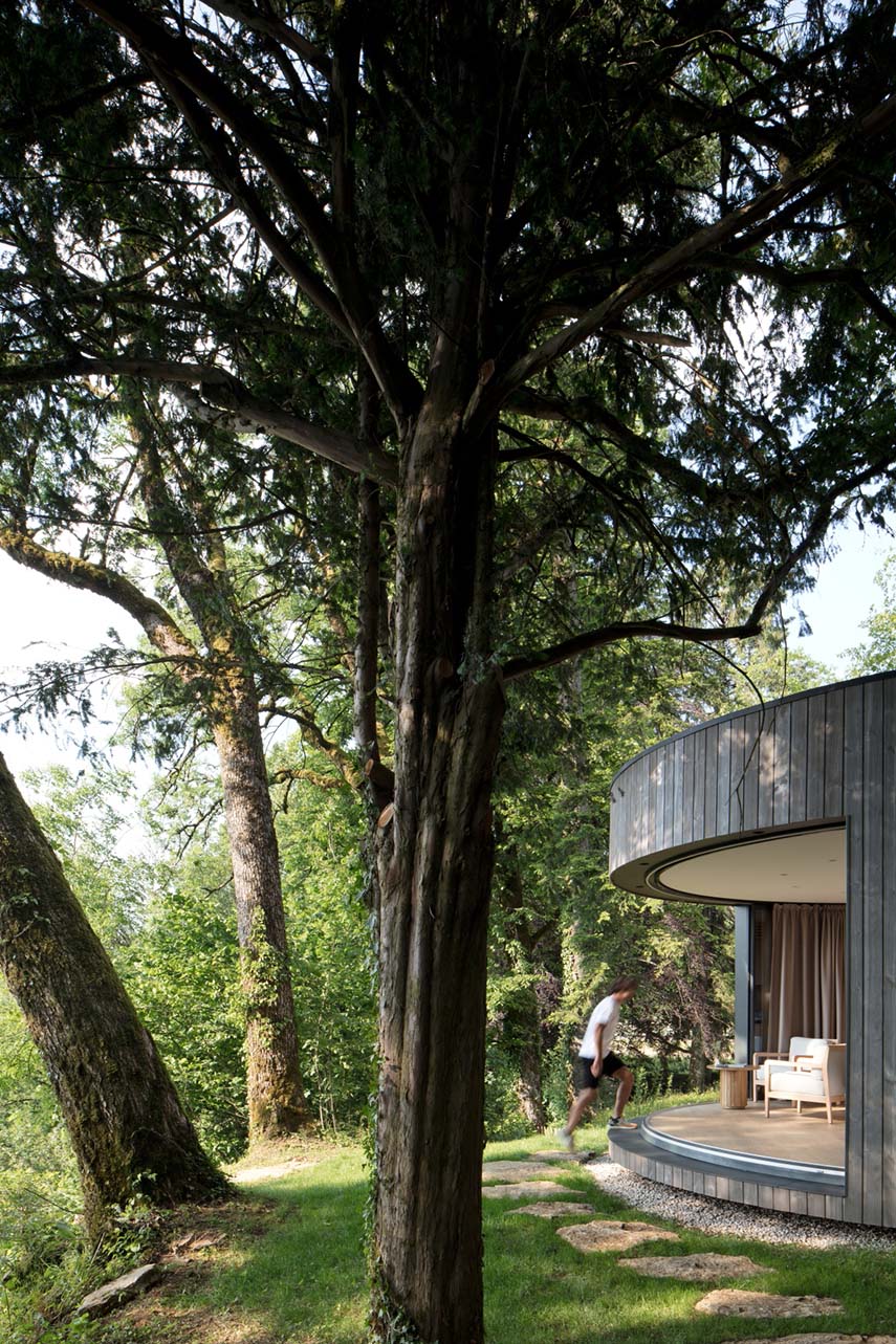 Au sommet d'un belvédère, dans le parc d'un hôtel 5 étoiles dans le Jura, LumiPod, la nouvelle chambre d'hôtel minimaliste de 26 m² conçue par LUMICENE, surplombe un panorama époustouflant et permet à ses occupants de se reconnecter avec la nature