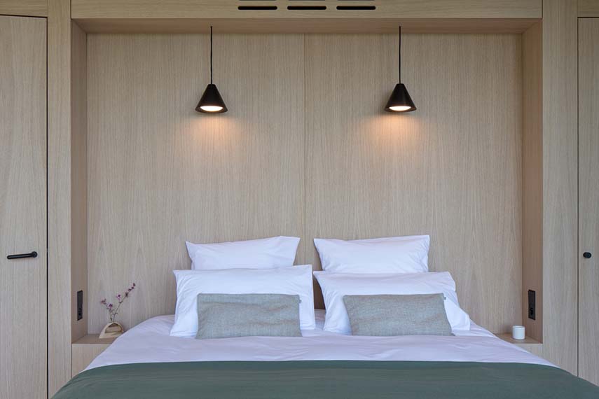 LumiPod est conçue autour de la fenêtre Lumicene, qui peut glisser pour s'ouvrir à 120°. Le module frontal abrite la chambre à coucher et le salon, meublés d'un lit king-size et d'une unité de rangement centrale, fabriquée sur mesure en chêne naturel. La grande fenêtre courbe s'ouvre complètement pour offrir une expérience incroyable d'immersion dans la nature environnante. Le module arrière abrite la salle de bains avec douche, lavabo et WC, ainsi qu'une armoire au plafond. Le sol et les murs sont revêtus de carreaux de céramique anthracite MOSA et les accessoires de salle de bains sont de AXOR