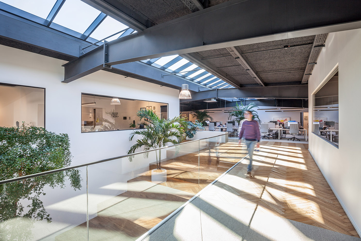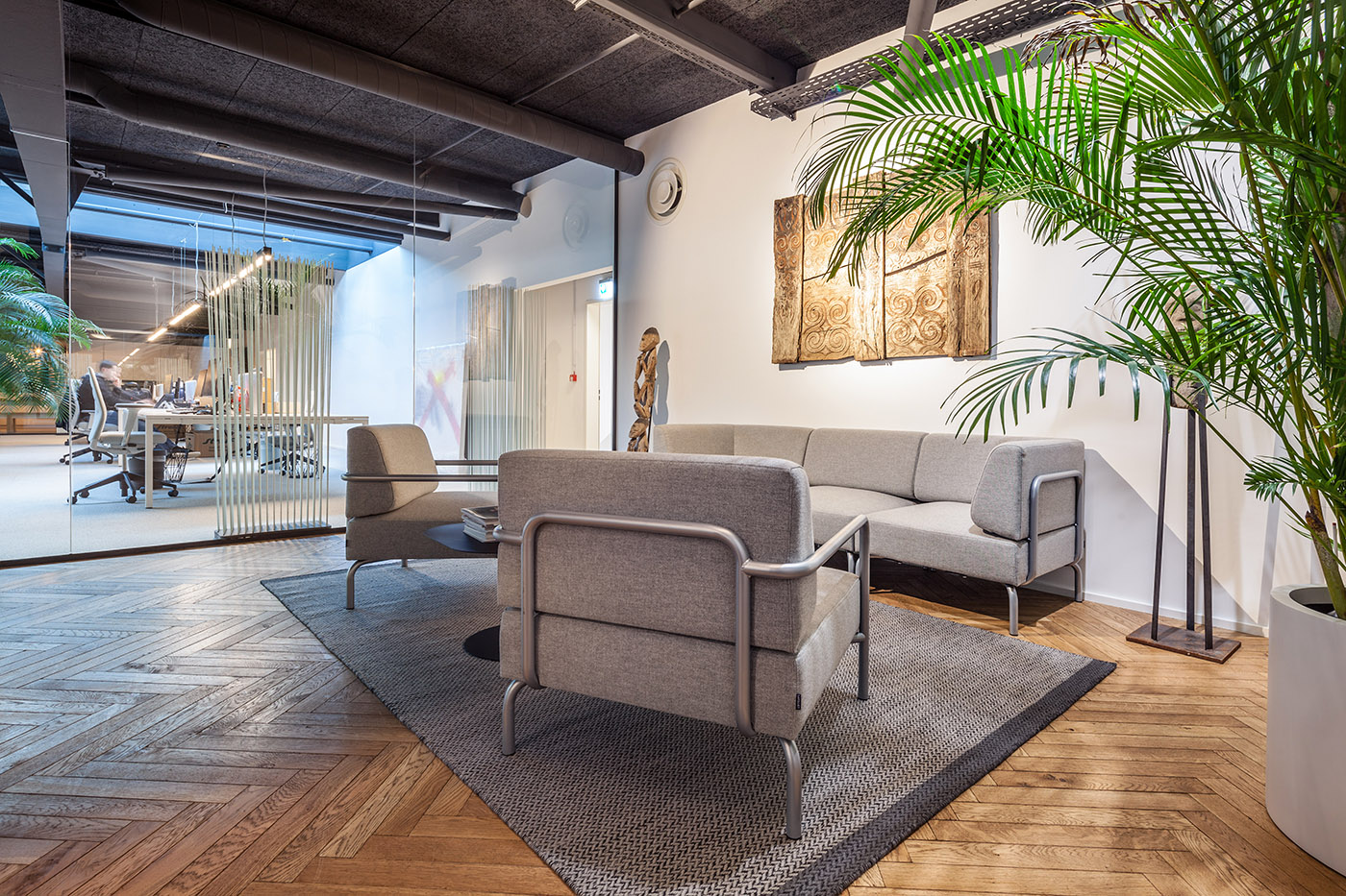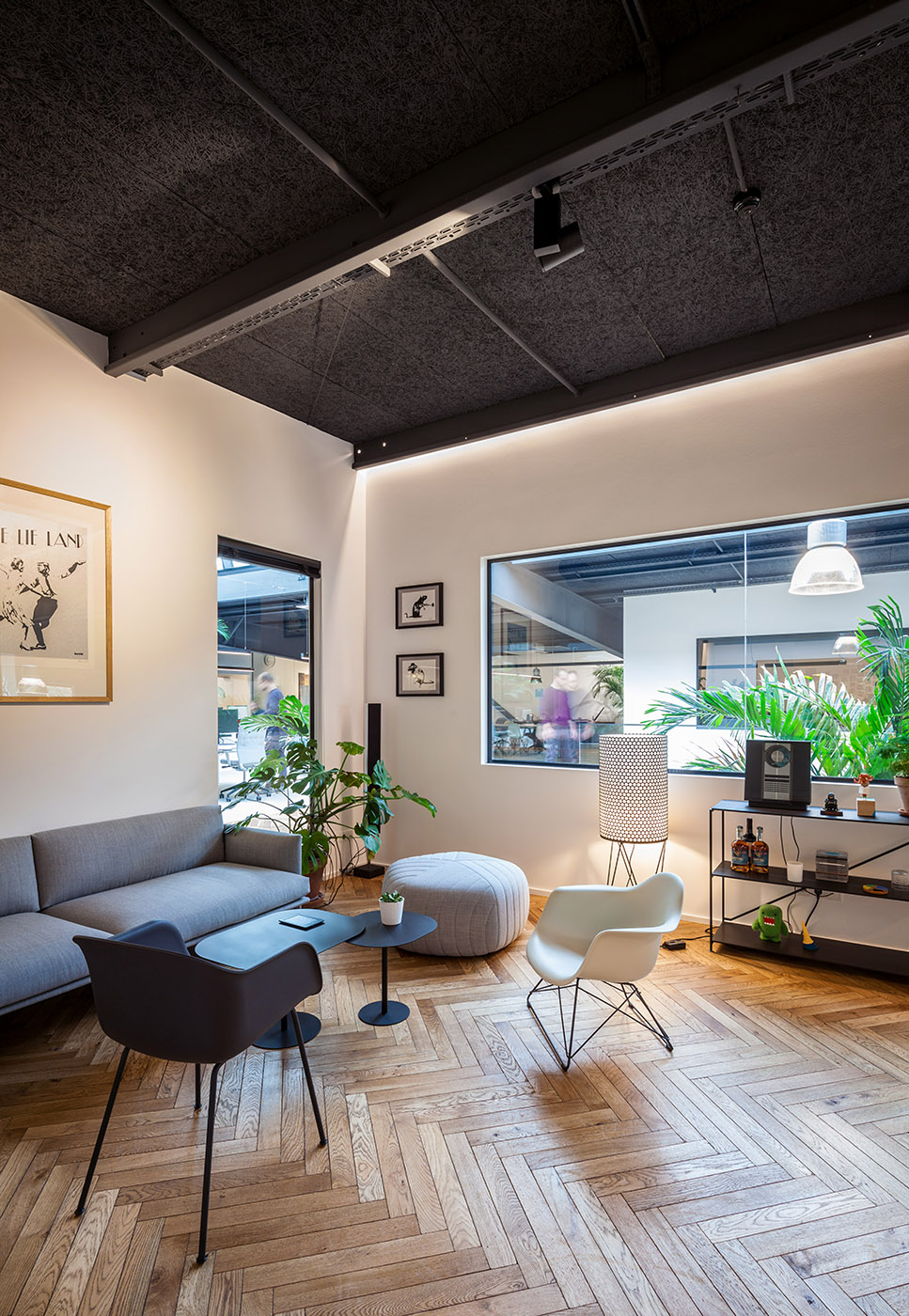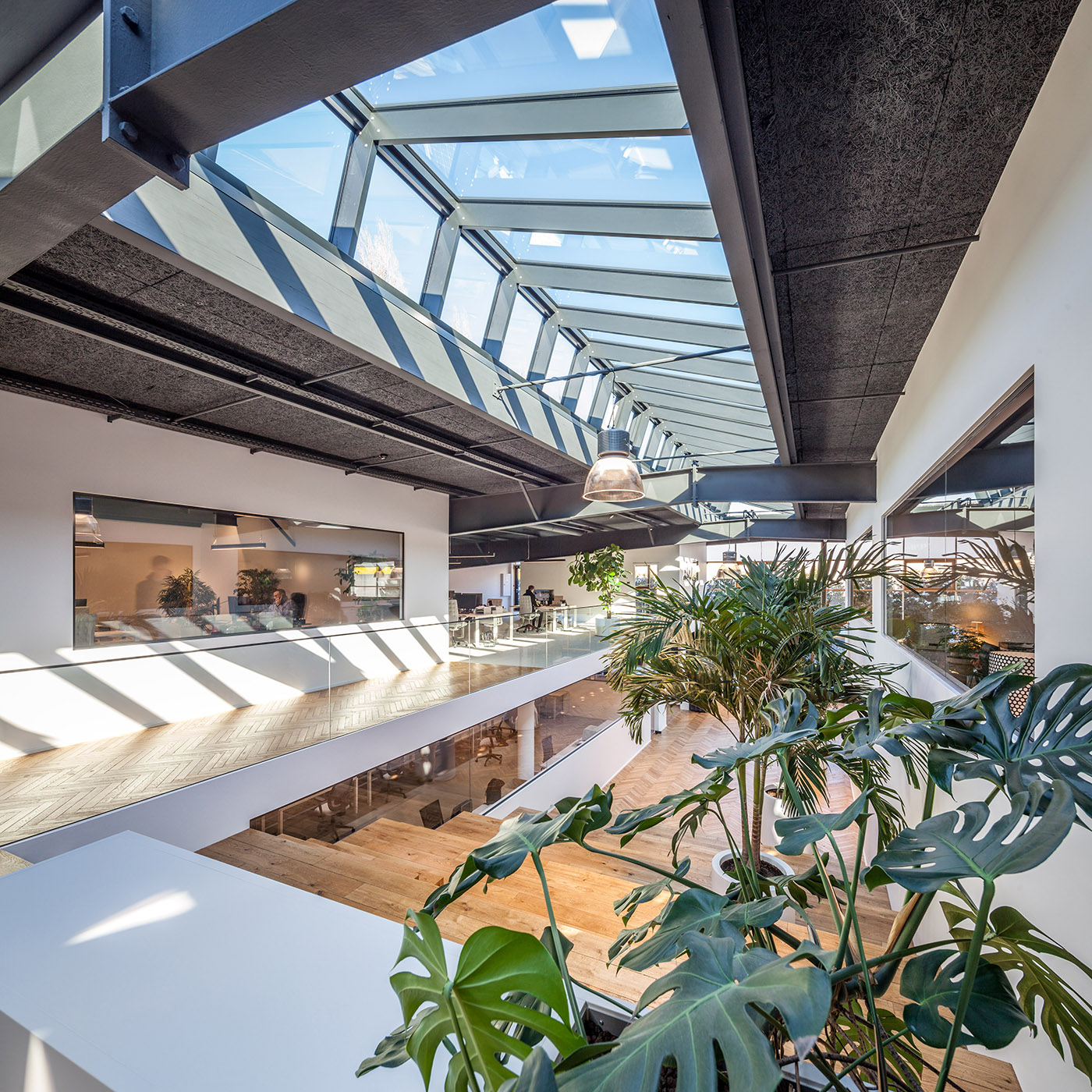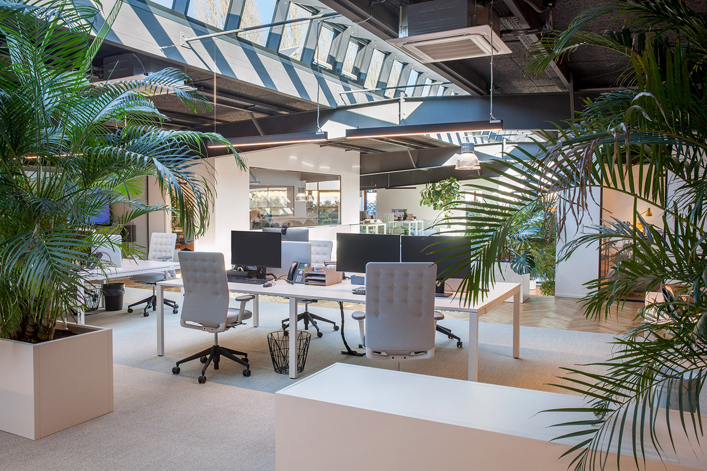 La palette de matériaux est très simple : blanc pur pour les murs, poutres en acier gris, et des détails ainsi que des revêtements en chêne qui contrastent avec les parties originales de l'entrepôt. Tous les espaces sont complétés par de grandes plantes qui créent un environnement de travail relaxant et accueillant