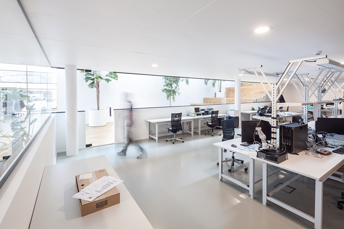 Entrepôt transformé en bureau. L'espace de travail est baigné de lumière naturelle