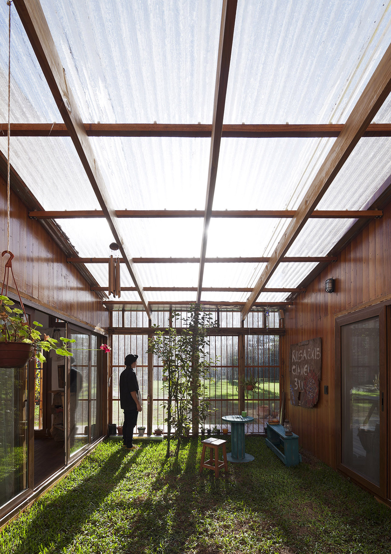Une ou deux pentes caractérisent la section. La structure porteuse est en bois avec des poutres qui se prolongent là où le mur est interrompu. Les façades extérieures sont revêtues de planches de bois disposées verticalement, à l'exception de deux éléments en polycarbonate ondulé transparent.