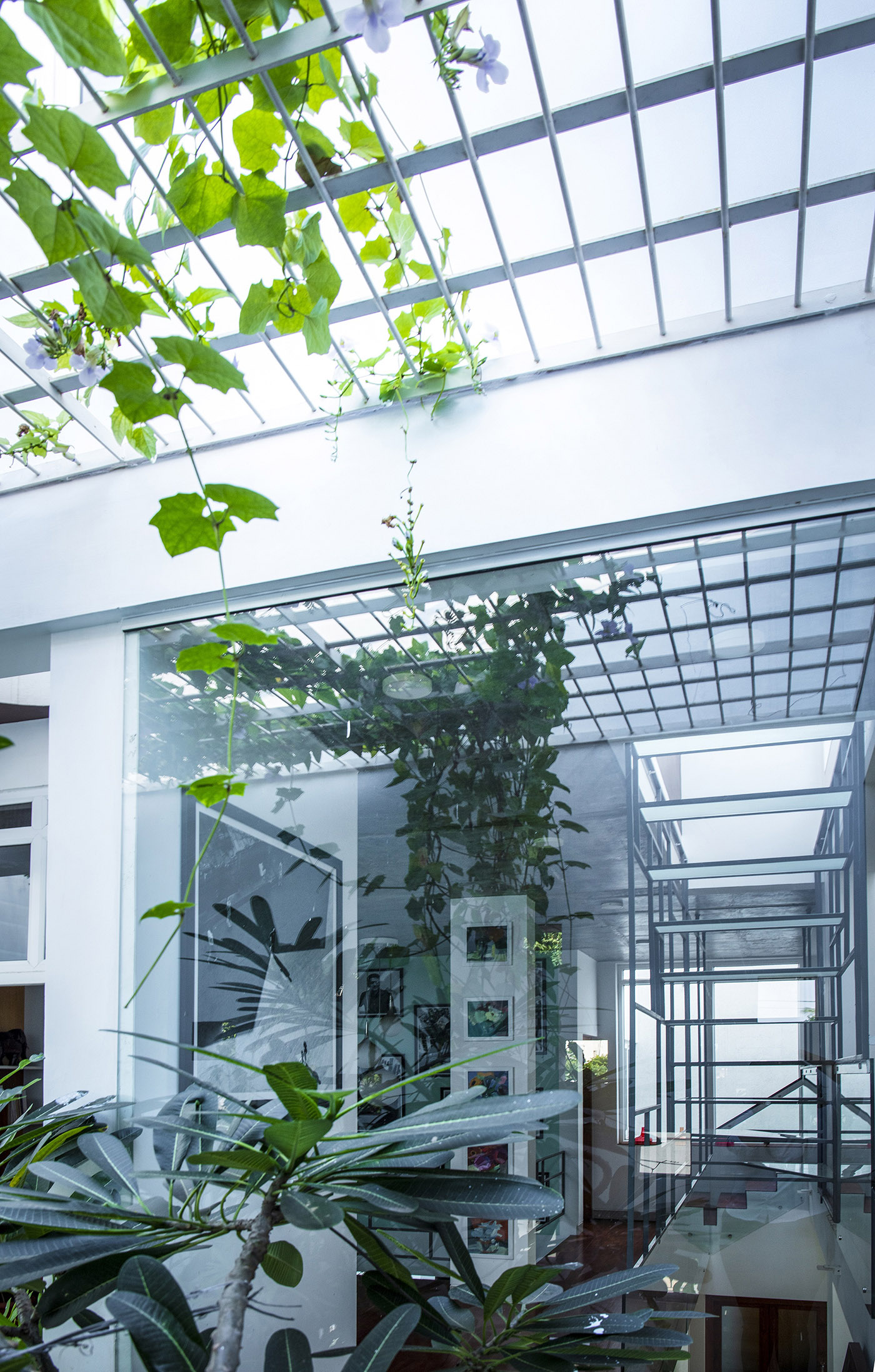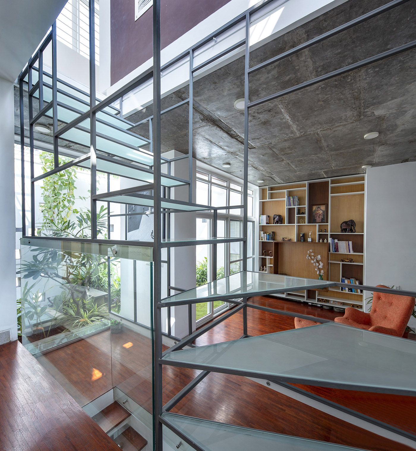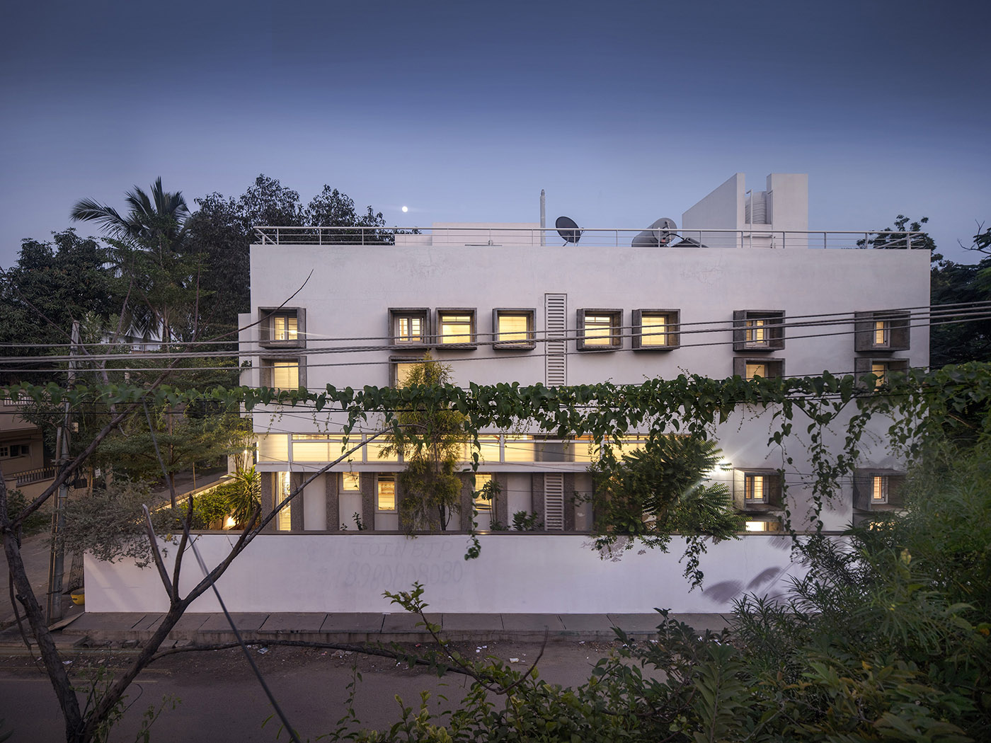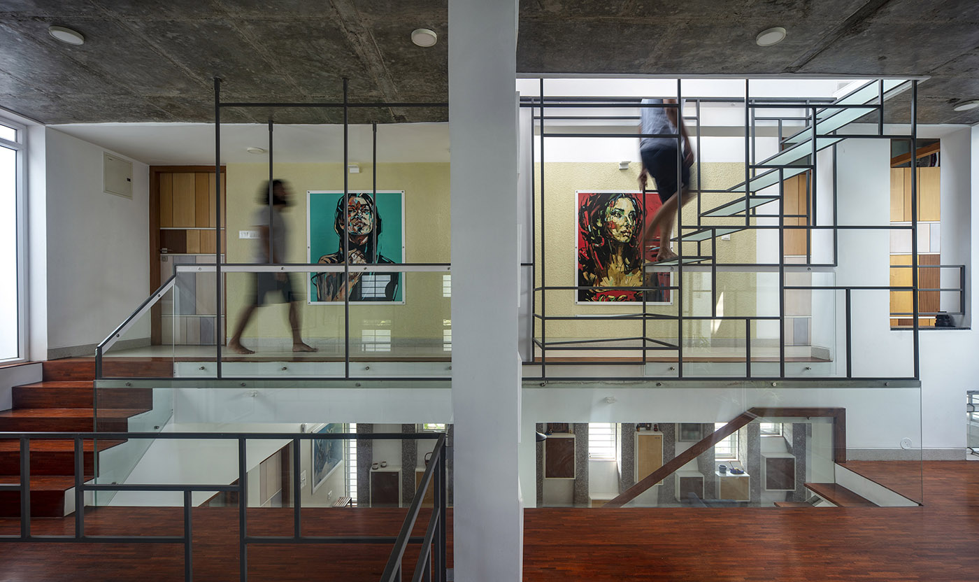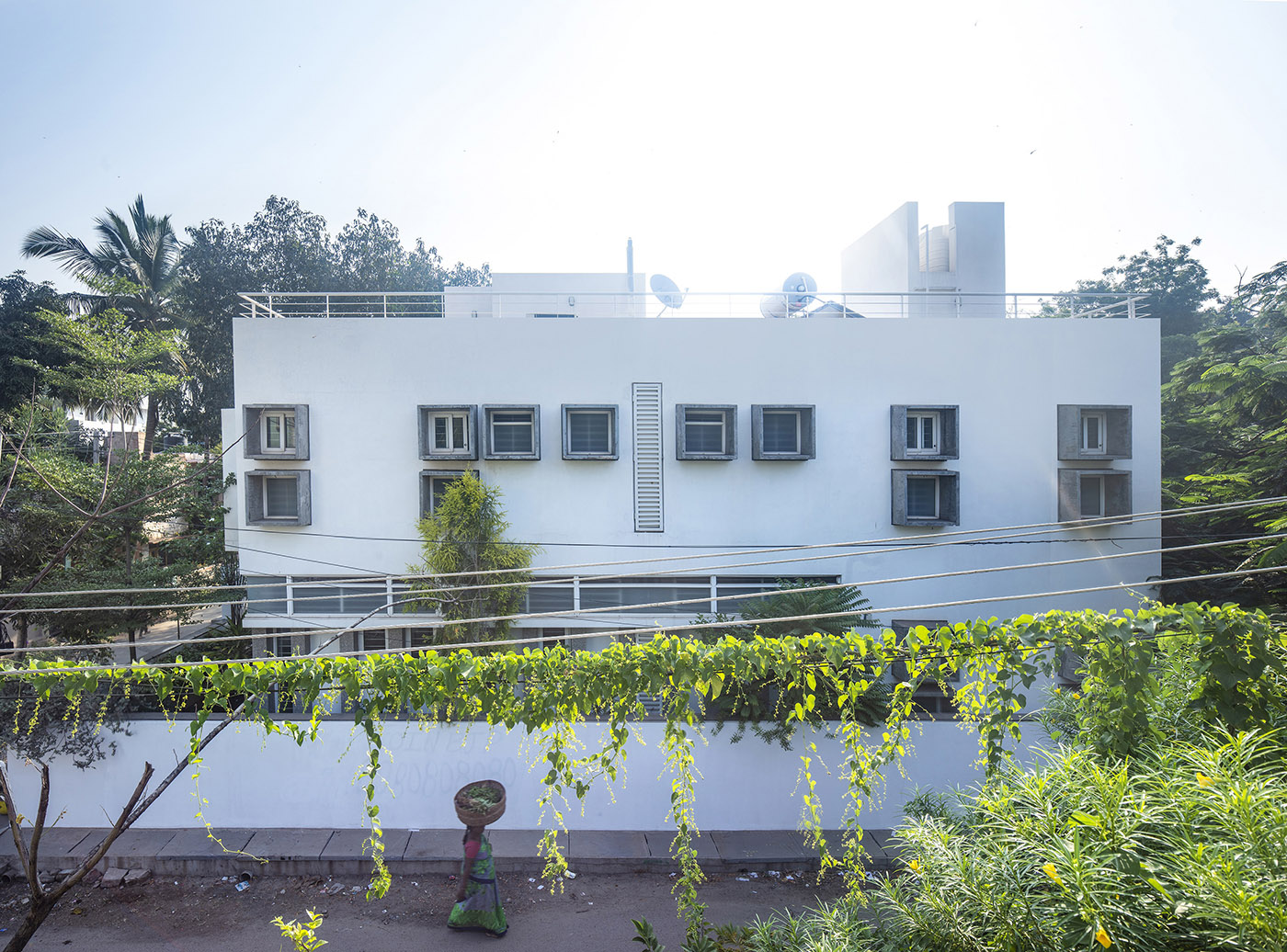 Bellary House est conçue par les architectes du cabinet Gaurav Roy Choudhury, un studio spécialisé dans les projets d'architecture innovants, afin de repousser la chaleur extérieure et de créer un microclimat convectif grâce à l'entrée de courants d'air frais. Les murs extérieurs préfabriqués en béton enveloppent la maison d'un geste protecteur, ponctués uniquement de petites et massives baies vitrées.