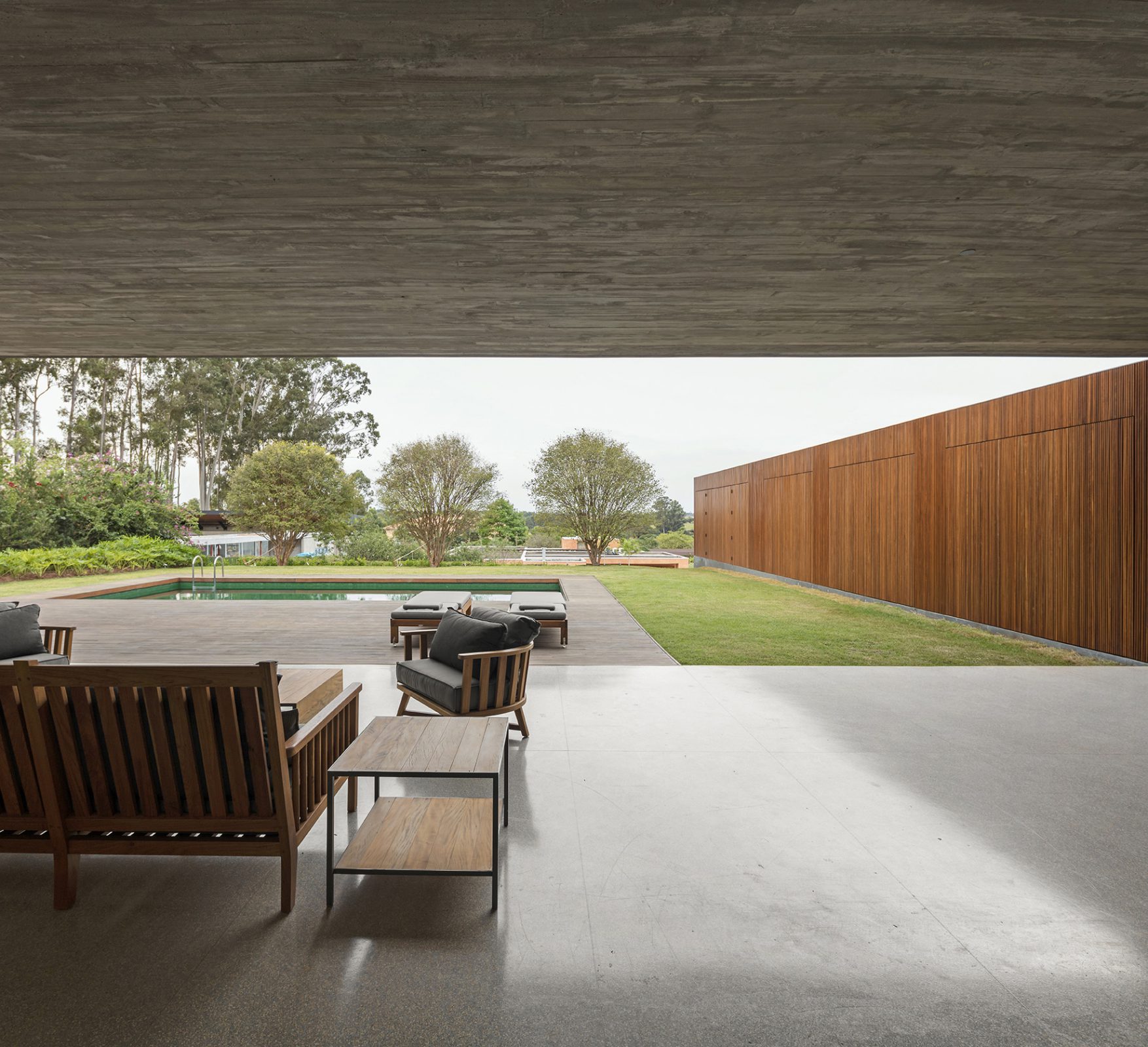 La Casa Pasqua, située à la Fazenda da Boa Vista à Porto Feliz, est composée d'un rez-de-chaussée en forme de "L" : un volume entièrement perméable avec un accès direct au jardin. Cette disposition exploite le terrain et marque la différence entre les usages sociaux et intimes de la résidence. Le concept de "cavité" offre une intimité sans barrières avec le paysage, où le passage du temps est marqué par l'entrée de la lumière, qui crée des dessins de lumières et d'ombres sur le sol avec différentes intensités.