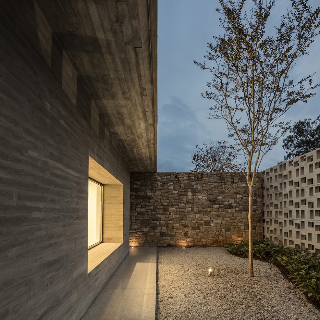 L'accès principal se trouve discrètement sur le côté, et est délimité par un mur fait de dalles de béton préfabriqué peintes en blanc qui définit la fine relation entre l'extérieur et l'intérieur, avec une vue délicate sur l'avenue bordée d'arbres qui se teinte saisonnièrement d'un rouge intense. Les murs latéraux du terrain ont été réalisés avec des pierres rustiques locales qui contrastent visuellement avec les éléments saillants du béton armé et relient l'espace semi-privé au jardin intermédiaire, devenant ainsi une zone sociale entièrement exposée.