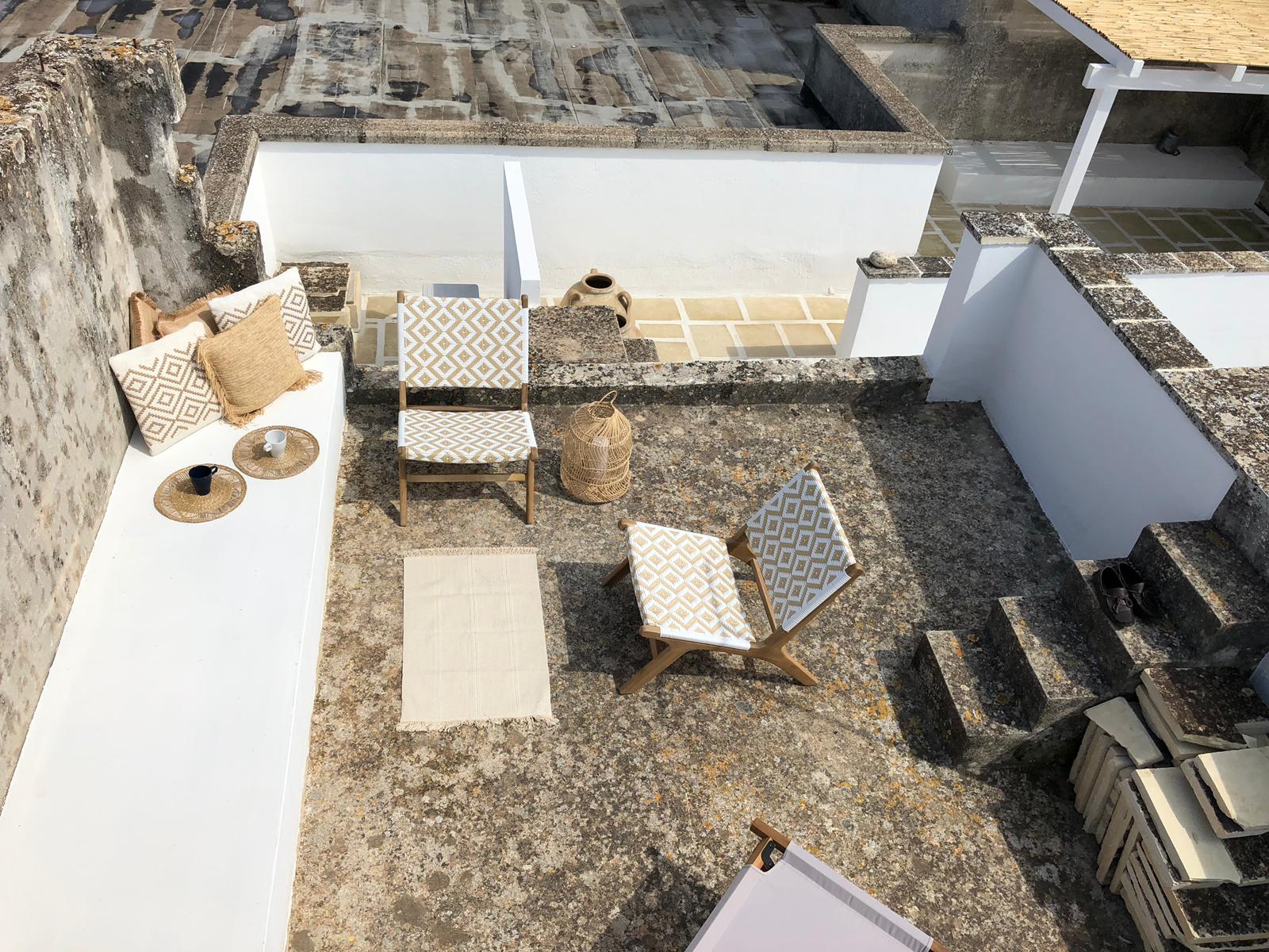 Une des trois terrasses, meublée dans un style arabesque, crée un coin paisible avec des éléments marocains. Le mobilier est également d'Acqua di Puglia, sobre et élégant, inséré dans un environnement rural-chic capable de mettre en valeur la beauté du Salento, avec ses formes, ses parfums et ses matières premières
