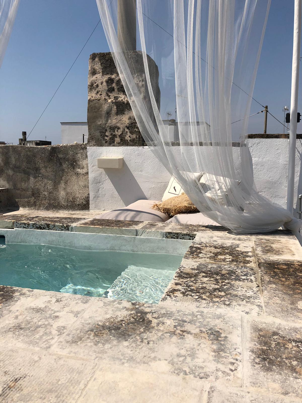 Les terrasses, où l'on peut se détendre et prendre le soleil, sont accessibles par un ancien escalier d'origine. Grâce à un ancien volume existant, il a été possible d'insérer une petite piscine pour se rafraîchir. La Maison Salentina présente les caractéristiques typiques du paysage des Pouilles : des murs solides, des fenêtres bleues et un système de terrasses revêtues de pierre locale