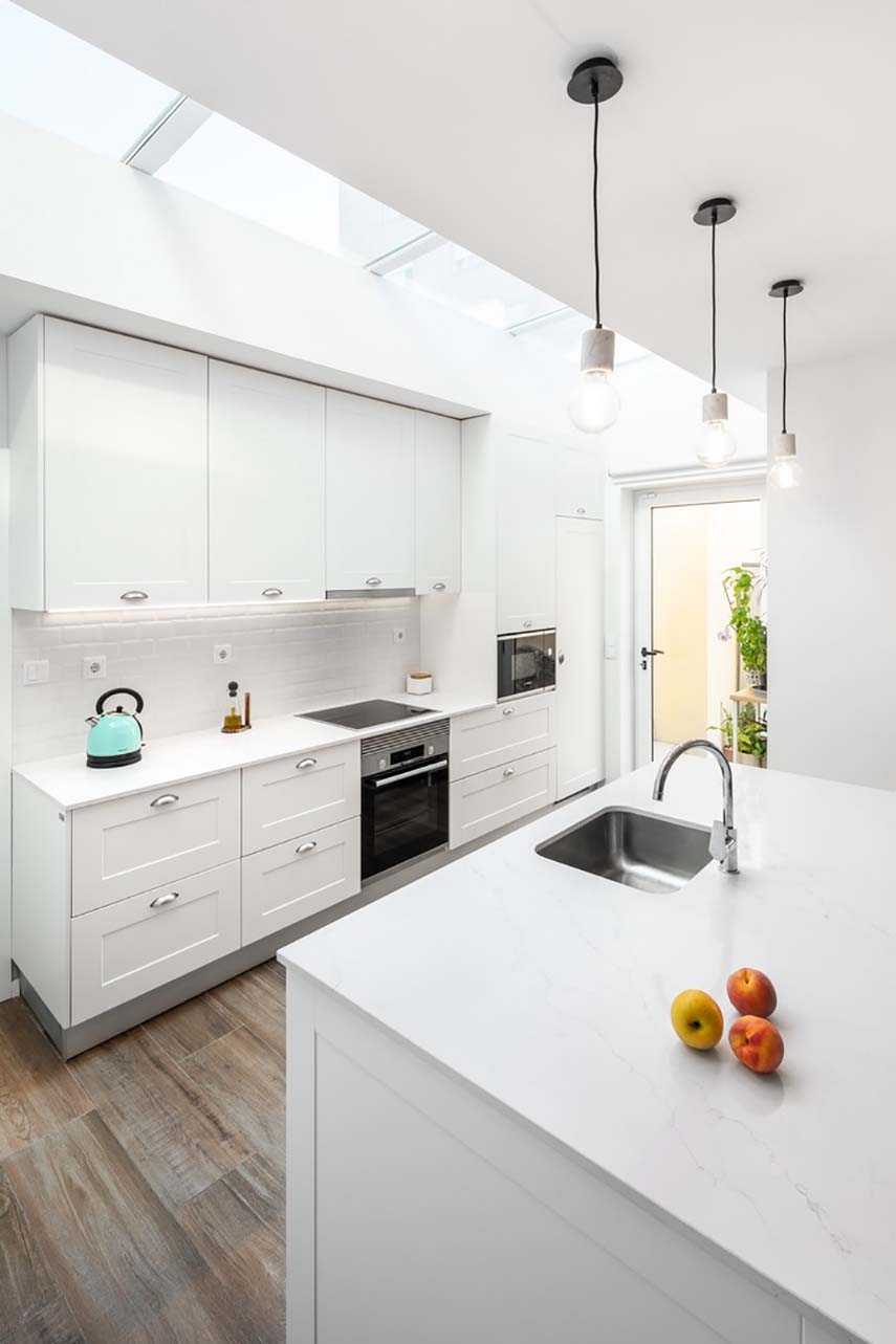 Le cabinet d'architecture Ren Ito Arq a utilisé une partie de la façade disponible pour réaliser la rénovation du bâtiment. Actuellement, au premier étage, il y a un espace où le salon, la salle à manger, la cuisine et un grand hall d'entrée sont intégrés. Au deuxième étage, il y a deux chambres à coucher : une pour le couple et une pour les enfants, une salle de bain commune et à côté de celle-ci, la suite qui possède sa propre salle de bain et un dressing. Il y a également un bureau donnant sur le hall d'entrée.