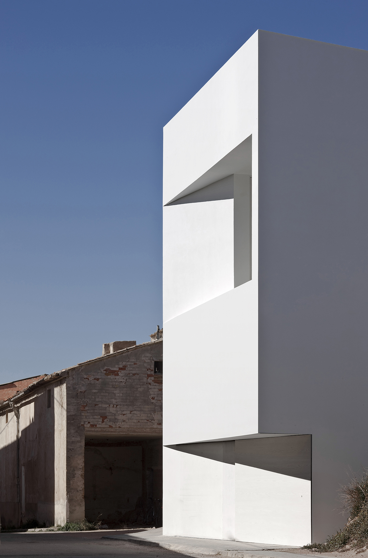 Conçu par le studio d'architecture Fran Silvestre Arquitectos, cette architecture exploite l'espace en se libérant dans le vide et en mettant en valeur, avec ses formes, les pentes inclinées de la montagne, reposant dans le sol comme un fragment blanc