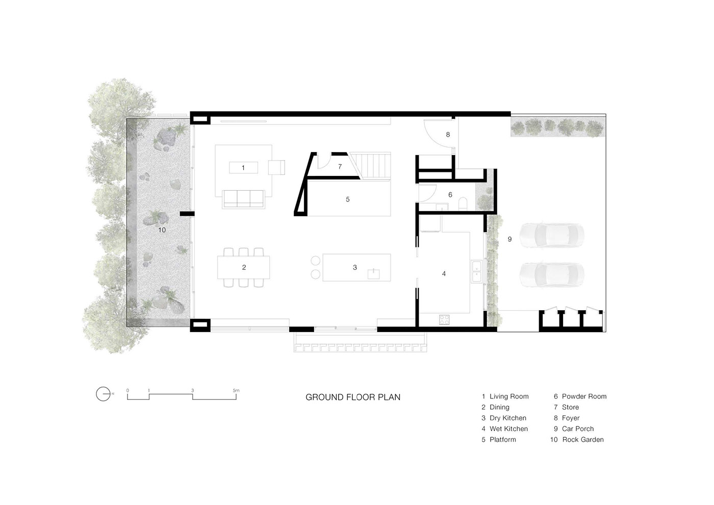 La continuité du matériau est également préservée dans la mezzanine avec l'ajout d'une galerie qui prolonge le sol existant et enveloppe la périphérie des espaces habitables à double hauteur. Cet espace fonctionne comme une passerelle équipée d'étagères et de placards de rangement, éclairée par de grandes baies vitrées. À l'extrémité de la galerie, se trouve une zone de jour/studio qui semble flotter et offre une vue sur les cimes des arbres. Le jardin a été transformé en un jardin de roches sculptées offrant un refuge paisible