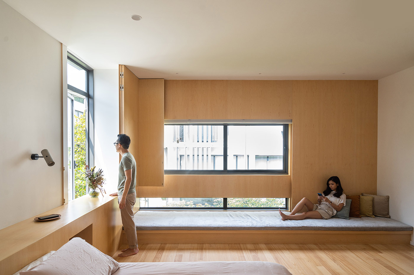 La chambre principale a été agrandie aux dépens d'une autre chambre existante afin de créer un environnement à aire ouverte. Les murs intérieurs ici ont été intentionnellement construits plus bas que la hauteur du plafond pour permettre à la lumière de se répandre dans toute la pièce. Cette atmosphère lumineuse amplifie la perception d'un espace en expansion. La chambre d'enfant est réimaginée comme un jeu de cache-cache à plusieurs niveaux : un lit superposé à 3 étages avec un lit gigogne et une cachette d'où l'on peut regarder à travers une lucarne existante