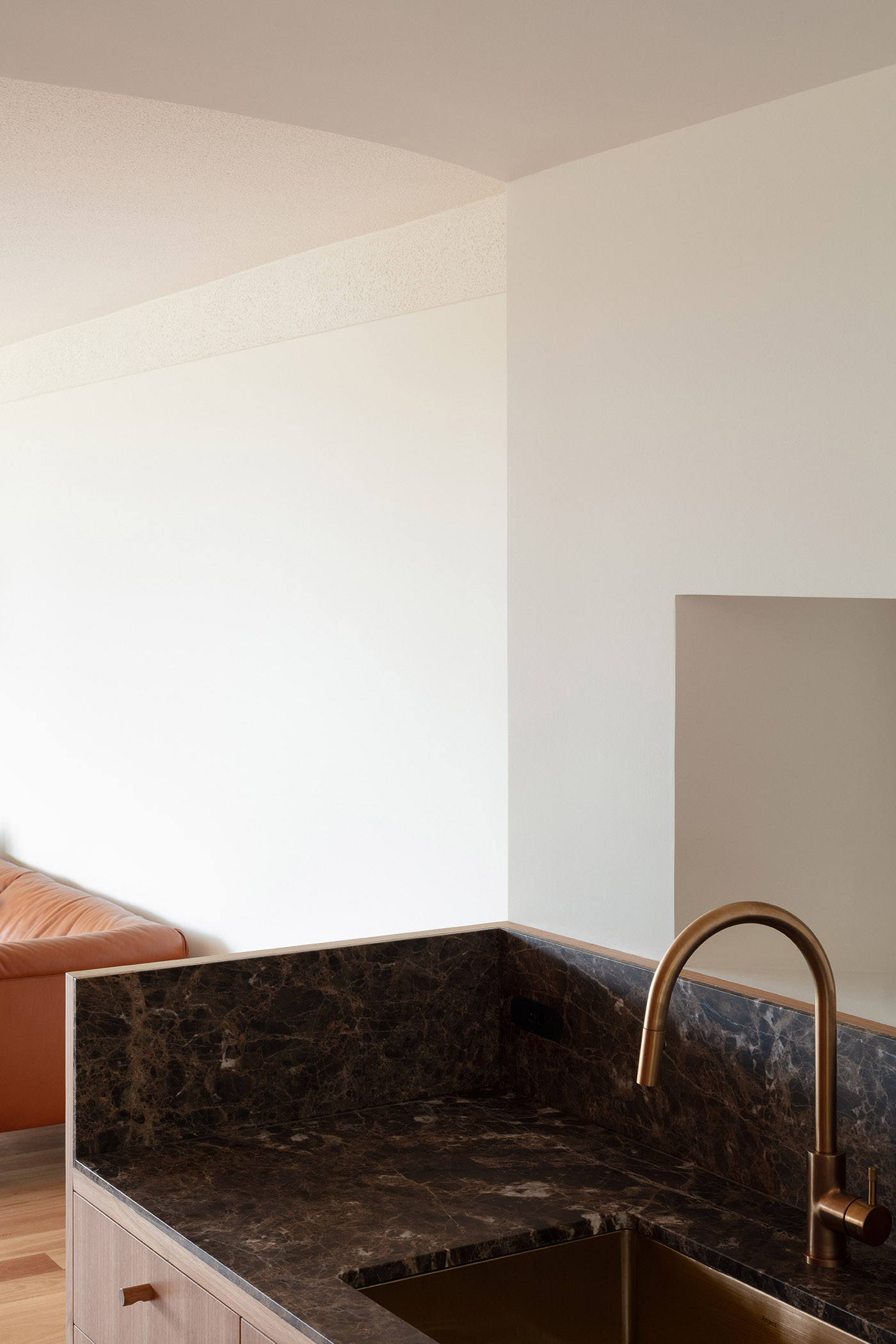 The renovation project for MB Apartment aspired to transform the existing logic of the space with a series of small surgical interventions reinventing the spatial experience but on a limited budget. The design intent was to sculpt and refine the space by giving clients solidity and a sense of protection