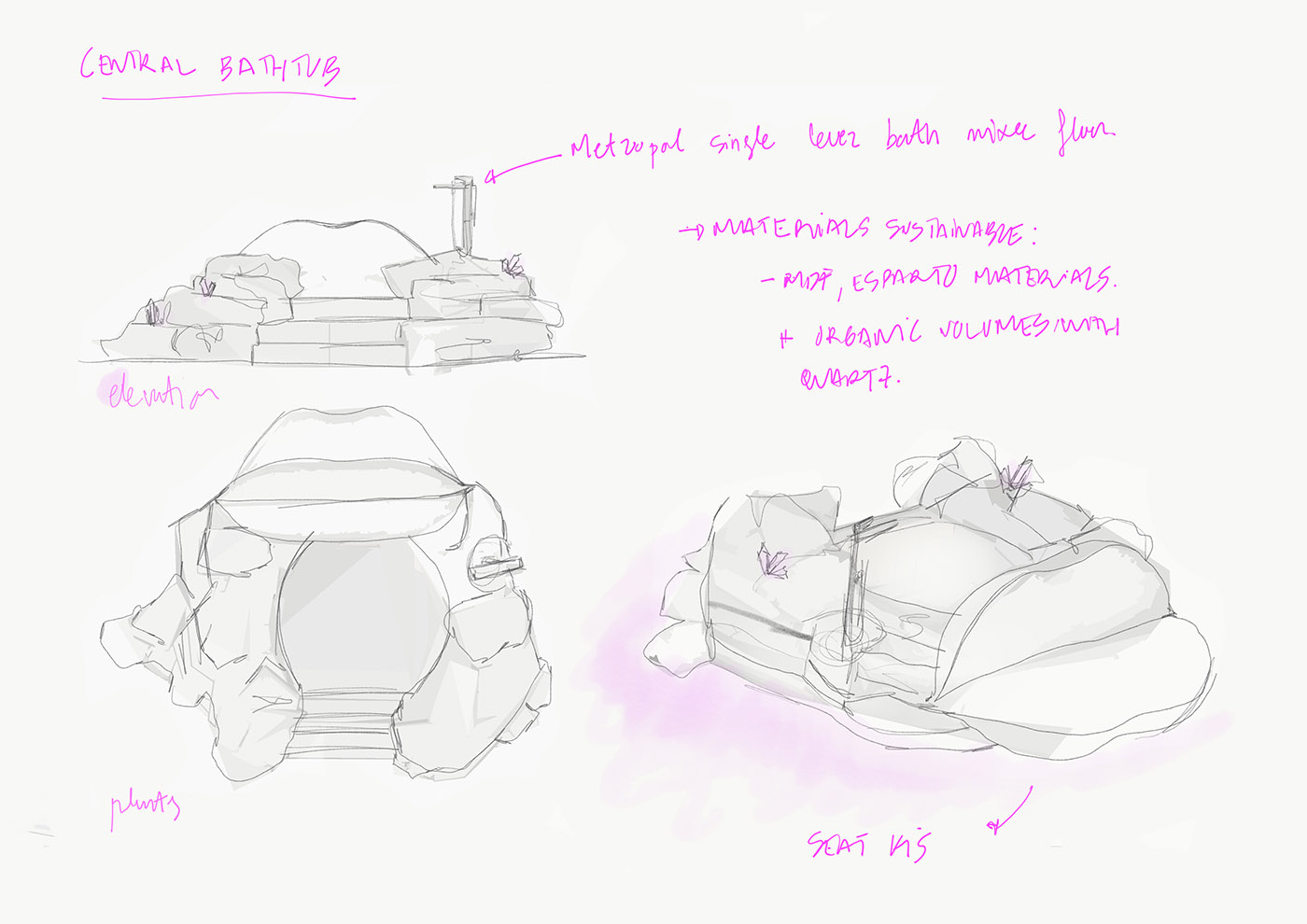 C'est pourquoi, les différents volumes et les formes organiques conçus par le studio Patricia Bustos, associés aux matériaux bruts, renvoient à la terre mère. Le cabinet d'architecture utilise souvent des matériaux naturels pour ses projets de design d'intérieur. Dans ce cas, la beauté des pierres précieuses naturelles et du verre entourant la zone de la baignoire rend l'environnement unique.