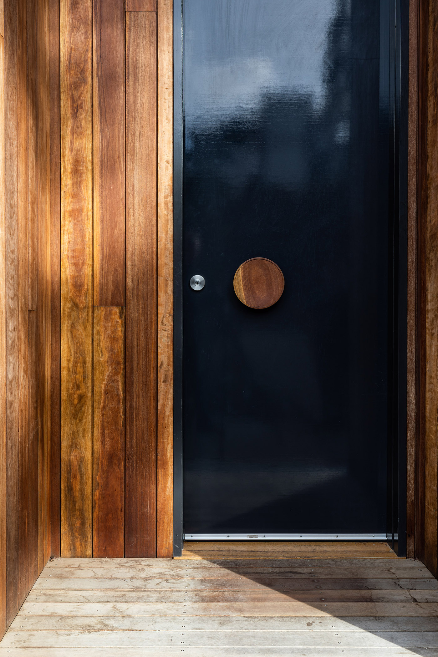 La protection en bois sur la façade orientale contribue à la sensation d'intimité et d'isolement de la maison. Le côté ouest est enveloppé d'une bande pour augmenter les vues panoramiques, tout en maintenant les zones vitrées au minimum. La perception du lieu est une priorité pour le projet: la lumière et les vues sur la rivière Pitt Water définissent l'expérience de vivre au sommet de la falaise