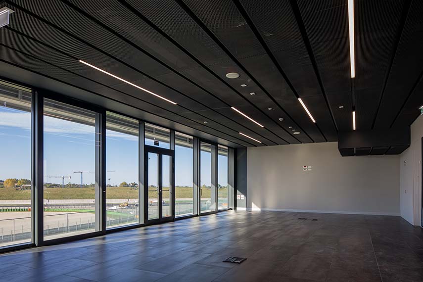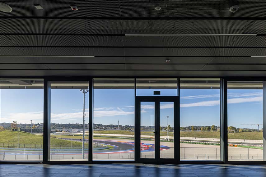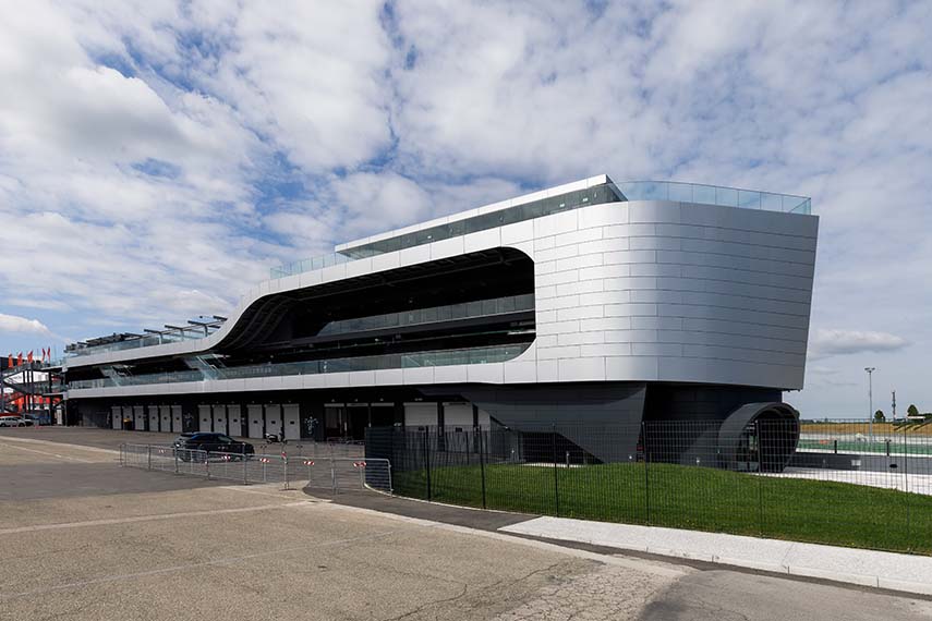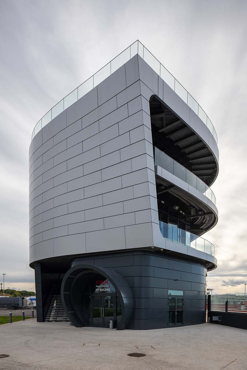 L'intervention d'extension du bâtiment PIT du Misano World Circuit Marco Simoncelli, réalisée par Mijic Architects Srl, se concentre sur le bâtiment existant donnant sur la ligne droite de départ et d'arrivée, cœur visuel et émotionnel du circuit. Le nouveau volume, long d'environ 112 mètres supplémentaires pour une extension totale de près de 200 mètres, vise à créer un signe architectural fort, reconnaissable depuis n'importe quel point de la piste et capable de raconter l'identité du Misano World Circuit. L'extension non seulement renforce la fonctionnalité de la structure, mais redéfinit son image, devenant un élément emblématique du complexe sportif.